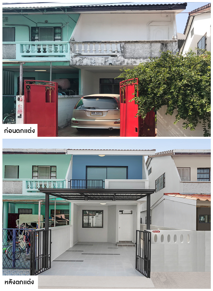 จากบ้านหลังเก่าที่ดูทึบทึม ไม่ปลอดโปร่ง มีสีซีดจางไปตามกาลเวลา เราได้ทำการทาสีใหม่ทั้งหลังให้มีความสวยงามโดดเด่น สะอาดตา ทำให้บ้านดูมีชีวิตชีวายิ่งขึ้น ต่อเติมเต็มโรงจอดรถด้วยหลังคาเมทัลชีทกันความร้อน และพื้นกระเบื้องกันลื่น พร้อมเปลี่ยนรั้วแบบใหม่เพื่อความสวยงาม ทันสมัยรับกับตัวบ้าน