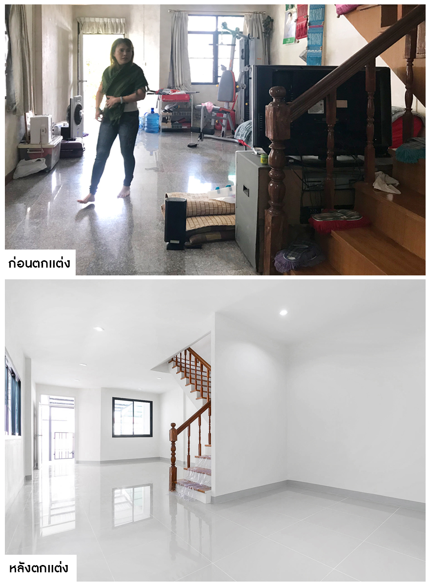 ภายในสัมผัสความกว้างด้วยสีภายในโทนขาวสว่าง ที่จะช่วยให้บ้านดูโปร่งโล่งยิ่งขึ้น นอกจากจะตกแต่งฝ้าเพดานใหม่แล้ว เรายังเปลี่ยนพื้นให้เป็นพื้นแกรนิตโต้แผ่นใหญ่ ที่จะทำให้ห้องดูกว้างขึ้น นิยมใช้ในบ้านยุคใหม่ พร้อมเพิ่มมิติให้กับโถงภายในด้วยแสงไฟดาวน์ไลท์ ที่ทั้งสวยงามและประหยัดไฟอีกด้วยครับ