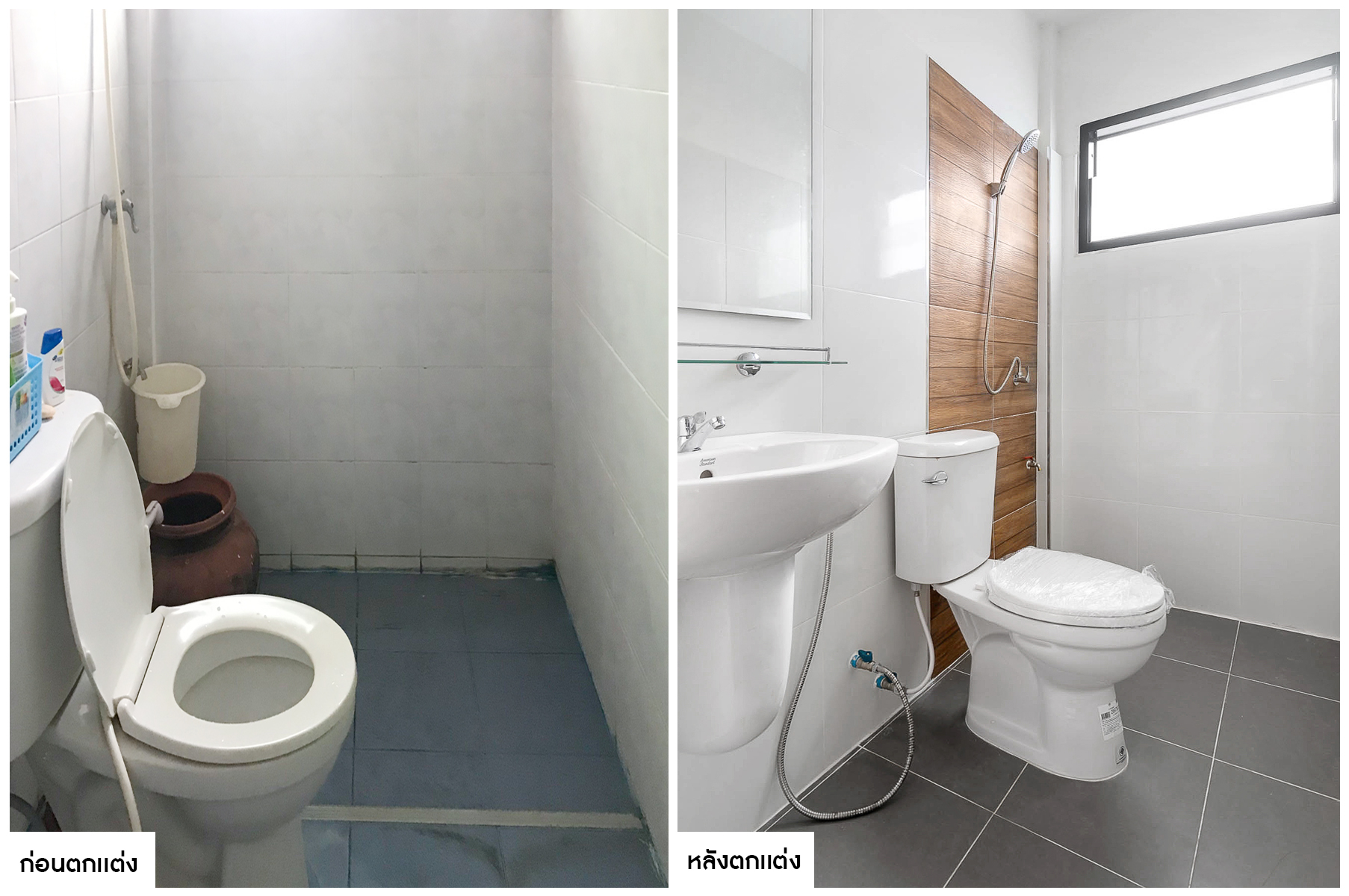 ตกแต่งสวยด้วยวัสดุคุณภาพเยี่ยม ครบครันทั้งฝักบัว อ่างล้างหน้า กระจก และสุขภัณฑ์คุณภาพเยี่ยม พร้อมปูพื้นจรดเพดานด้วยกระเบื้องกันลื่นเพื่อความปลอดภัยแก่ผู้อยู่อาศัย