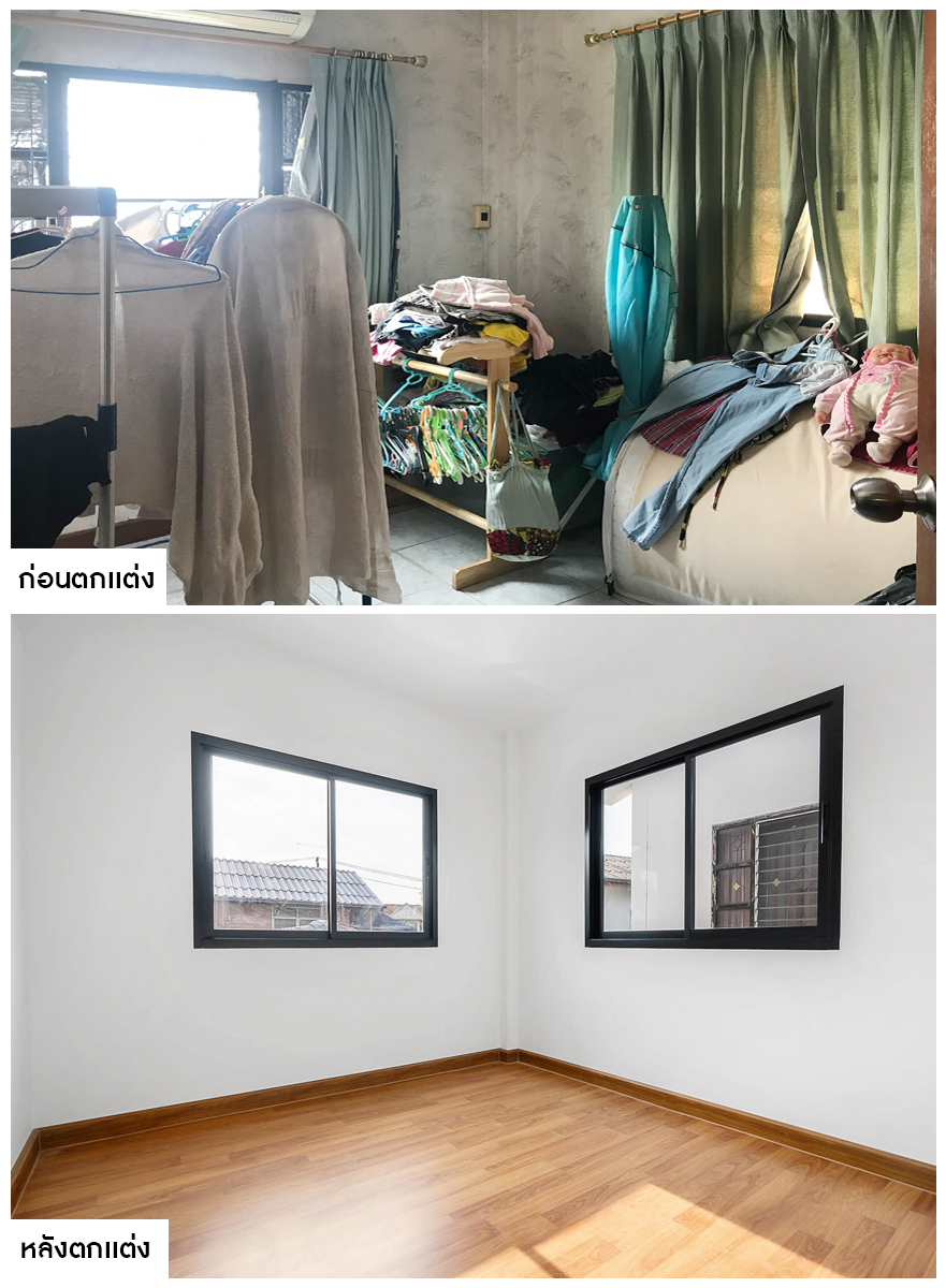 ตกแต่งเรียบง่าย เน้นความโปร่งโล่งด้วยโทนสีขาว เพิ่มความรู้สึกผ่อนคลาย และปูพื้นลามิเนท ที่ทั้งสวยงามและคงทน พร้อมติดตั้งหน้าต่างกระจกบานสไลด์ที่ช่วยประหยัดพื้นที่และทำให้ห้องปลอดโปร่ง พร้อมรับแสงธรรมชาติได้อย่างเต็มที่