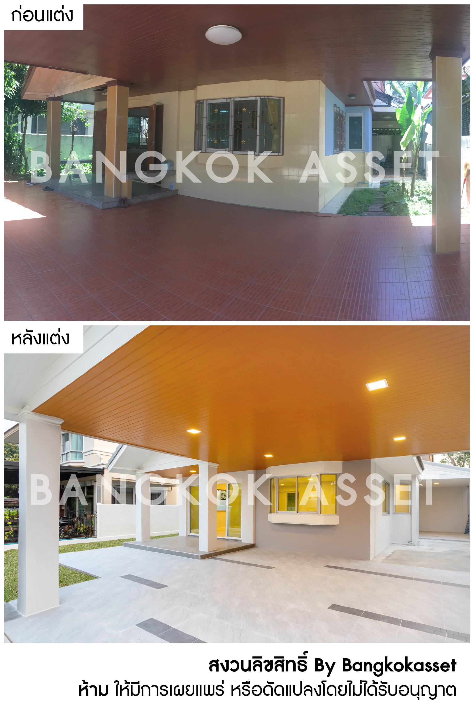 พื้นที่ลานจอดรถเราได้ปูกระเบื้องกันลื่นให้ใหม่ ที่เป็นลวดลายเฉพาะของบ้านบางกอก พร้อมเคลียร์พื้นที่ทั้งหมดให้ดูโปร่งโล่งยิ่งขึ้น และเปลี่ยนฝ้าหลังคาลานจอดรถให้ใหม่