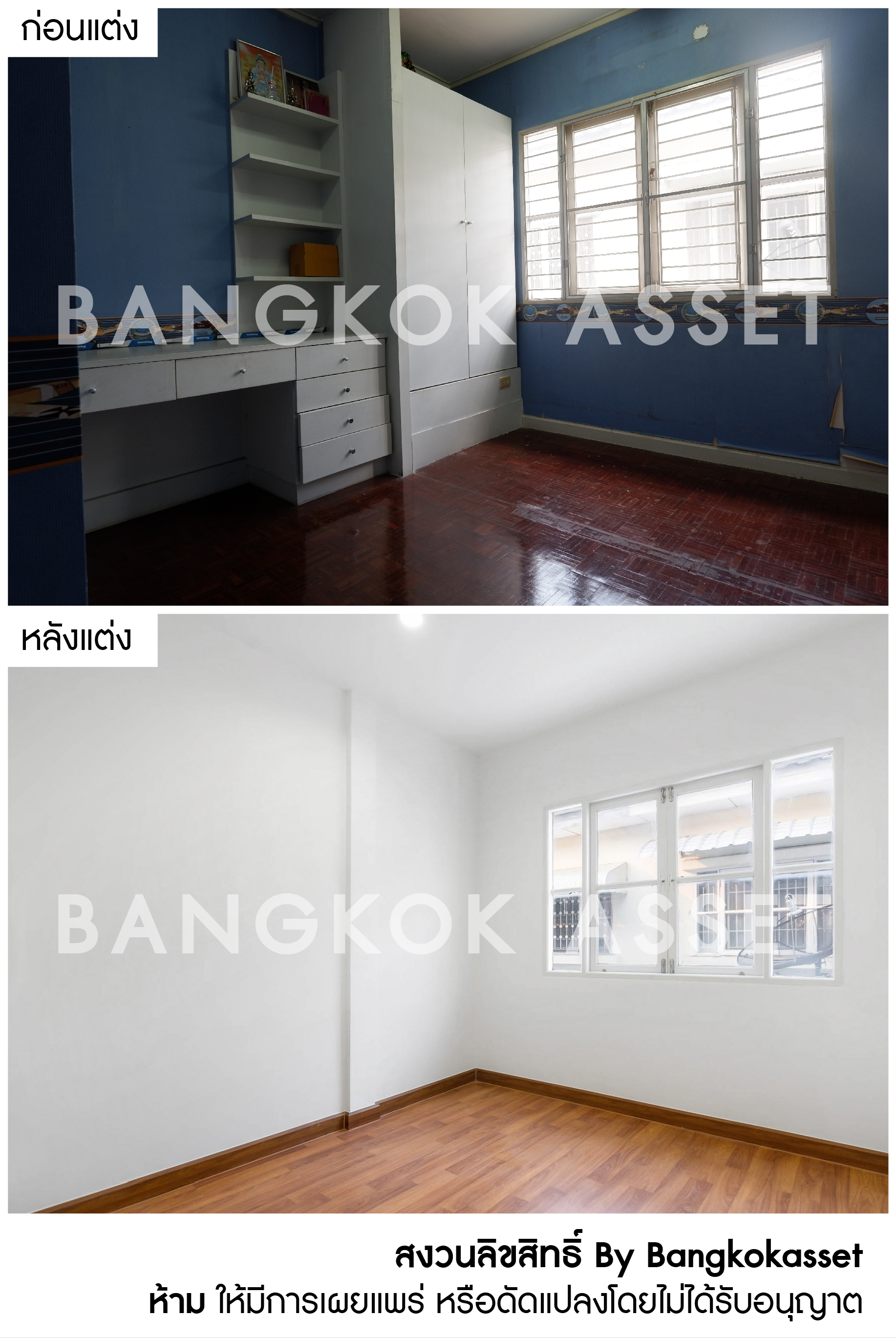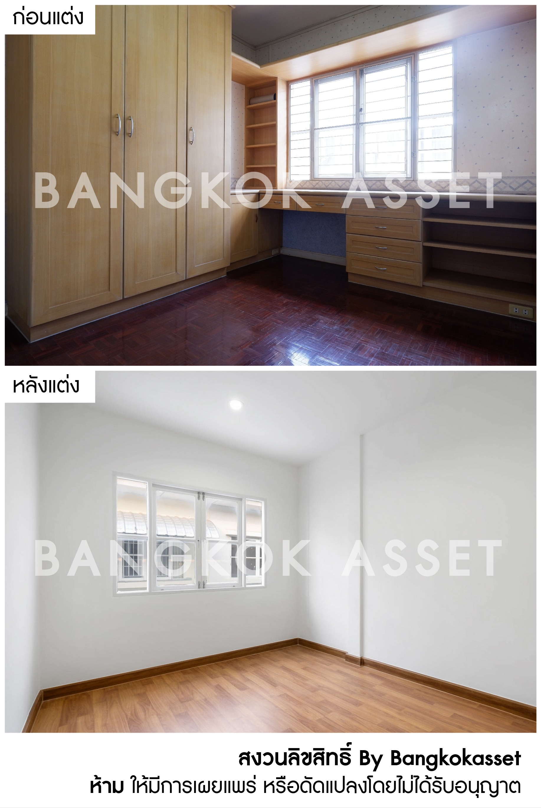 ห้องนอนทุกห้องเราเปลี่ยนเป็นพื้นลามิเนตให้ใหม่ทั้งหมด ให้ความสวยงาม คงทน และนิยมใช้ในบ้านยุคใหม่ โดยคุมโทนสีภายในห้องเป็นโทนขาวสว่าง เพิ่มความรู้สึกผ่อนคลายให้กับผู้อยู่อาศัยอีกด้วย