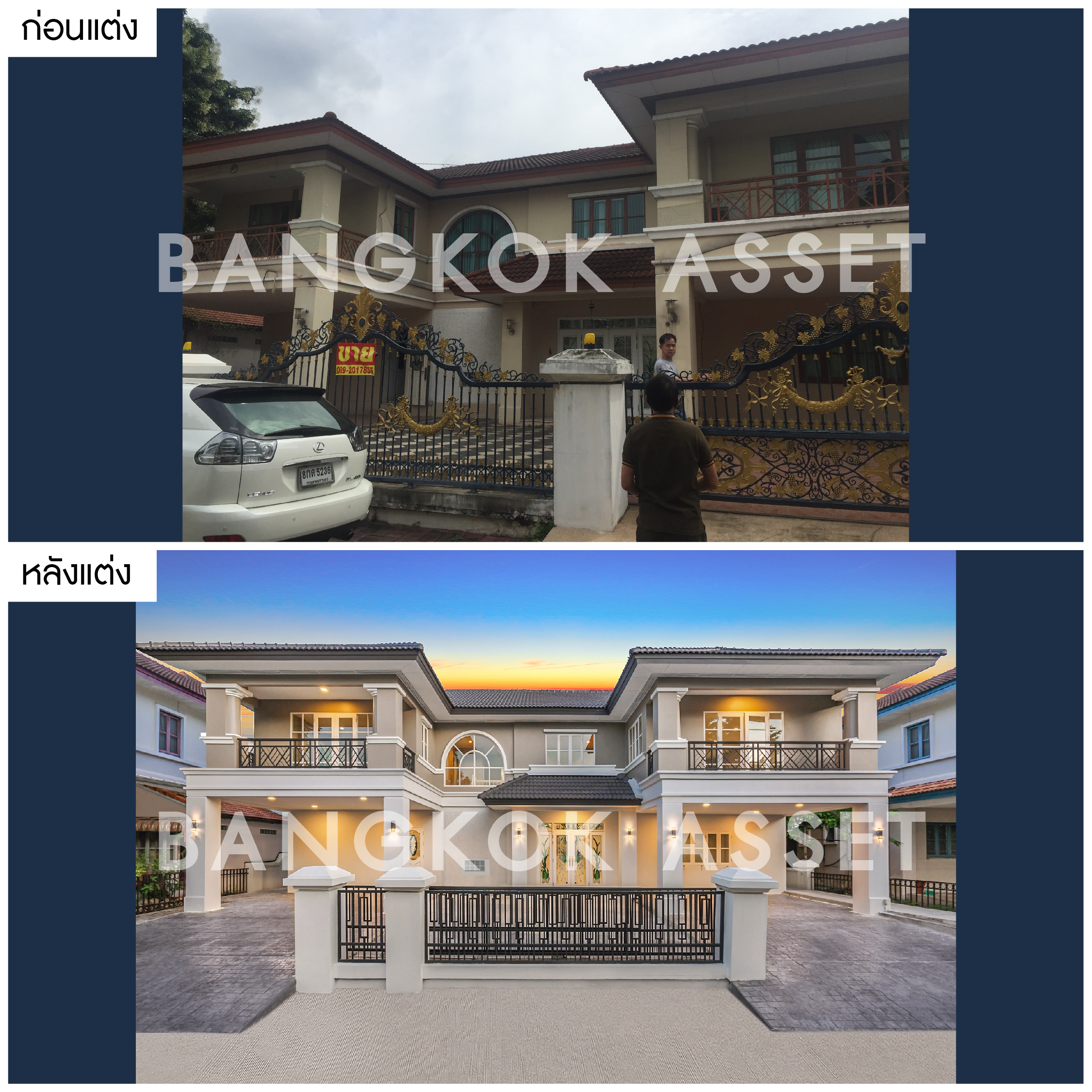 จากบ้านเดี่ยวหรูหลังเดิมที่มีสภาพเก่าตามการใช้งาน ได้แปลงสภาพตกแต่งใหม่ทั้งหลัง โดยการทาสีใหม่ รวมไปถึงรั้วบ้าน แต่ยังคงบ้านโทนสีเดิมไว้เพื่อเพิ่มความโดดเด่นและตกแต่งด้วยวัสดุคุณภาพพรีเมี่ยมทำให้บ้านสวยงาม น่าอยู่อาศัยมากขึ้น ส่วนพื้นที่ลานจอดรถเราปูกระเบื้องกันลื่นที่เป็นลวดลายเฉพาะของบ้านบางกอกให้ด้วยเช่นกัน