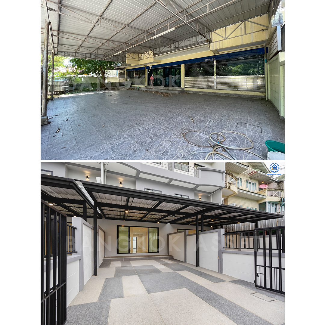 ในส่วนของที่จอดรถ เราเคลียร์พื้นที่ทั้งหมดให้ดูโปร่งโล่ง และเทพื้นทรายล้าง ที่กันลื่นได้เป็นอย่างดี พร้อมทำหลังคาเมทัลชีทให้ใหม่ ทำให้หน้าบ้านดูสวยหรูทันสมัยยิ่งขึ้น
