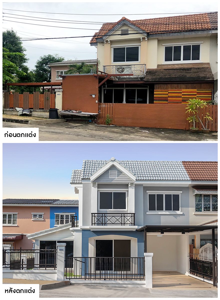 จากเดิมที่สภาพภายนอกดูเก่า เราได้ทำการทาสีใหม่ทั้งหลังโดยเปลี่ยนโทนสีบ้านให้มีความทันสมัย