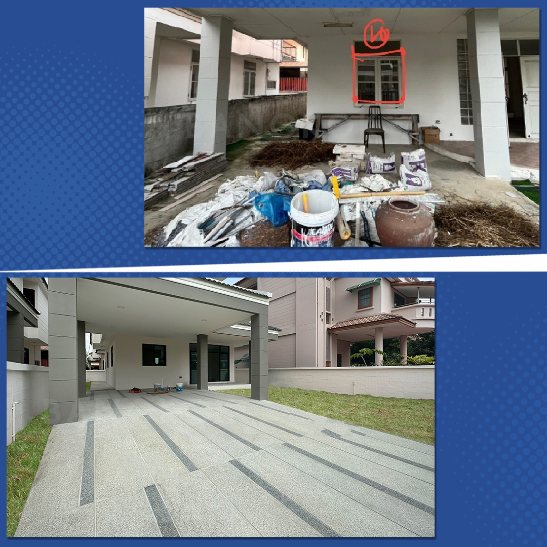 ที่จอดอัพเกรดใหม่เป็นพื้นทรายล้างที่นอกจากจะสวยงามแล้วยังกันลื่นได้เป็นอย่างดีด้วย ส่วนรอบบ้านจะปูหญ้าให้ใหม่ทั้งหมด