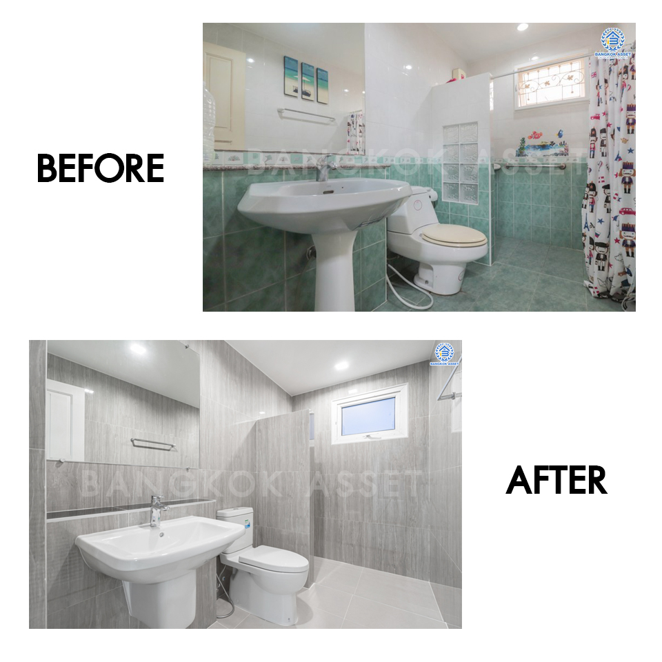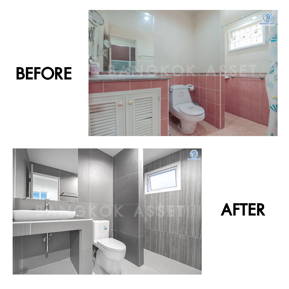 ห้องน้ำตกแต่งสไตล์โมเดิร์น เปลี่ยนสุขภัณฑ์ให้ใหม่ทั้งหมด เปลี่ยนกระเบื้องผนังใหม่ และเปลี่ยนกระเบื้องพื้นแบบกันลื่นเพื่อความปลอดภัย นอกจากวัสดุที่เปลี่ยนให้ใหม่หมดแล้ว เรื่องของระบบน้ำ ระบบระบายน้ำ และระบบไฟฟ้าเราก็ดูแลให้เช่นกันครับ