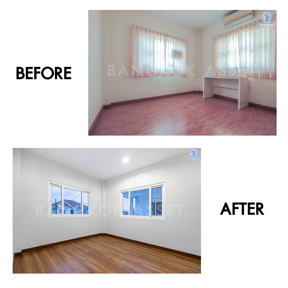 ห้องนอนทุกห้องเราเปลี่ยนเป็นพื้นลามิเนตให้ใหม่ทั้งหมด ซึ่งดูแลรักษาความสะอาดง่าย และทนต่อน้ำยาทำความสะอาดต่างๆ และทนต่อรอยขีดข่วนได้ โดยคุมโทนสีภายในห้องเป็นโทนขาวสว่าง เพิ่มความรู้สึกผ่อนคลายให้กับผู้อยู่อาศัยอีกด้วย