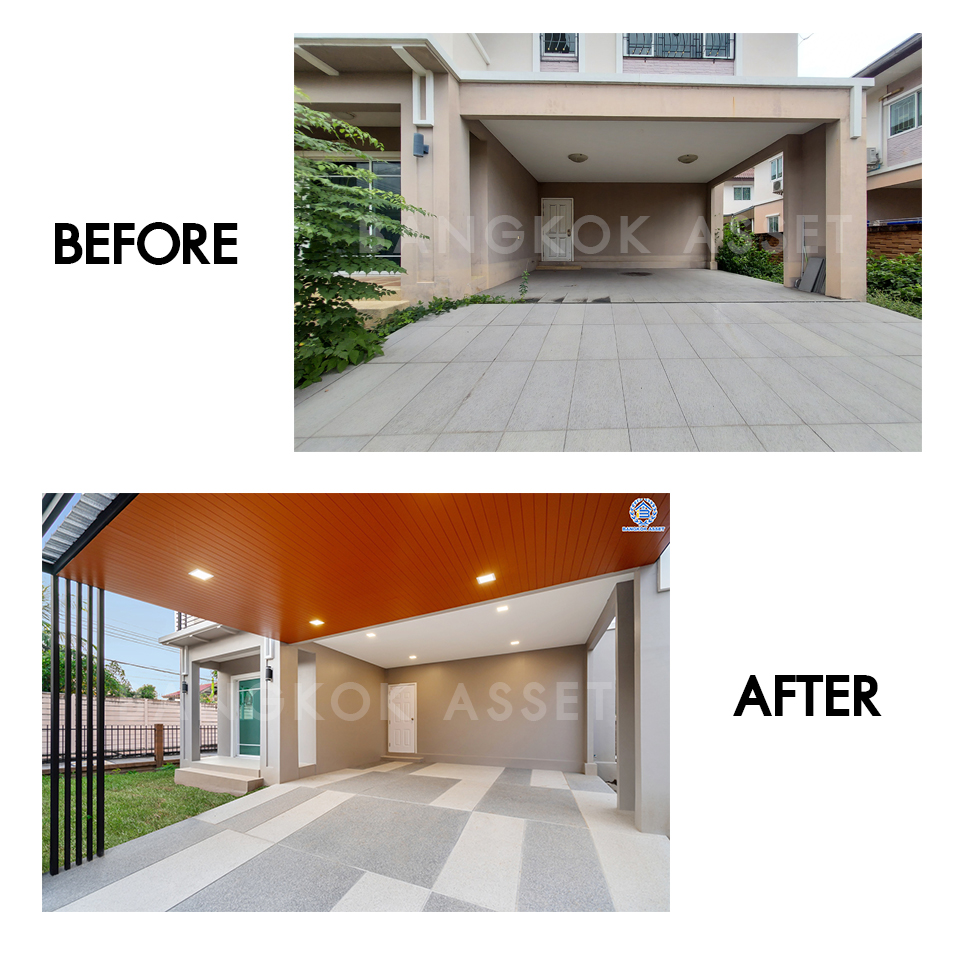 จากบ้านหลังเดิมที่เก่าตามสภาพกาลเวลา เราได้แปลงสภาพตกแต่งใหม่ทั้งหลัง ไม่ว่าจะเป็นการทาสีใหม่ให้ดูขาวสว่างยิ่งขึ้น และเพิ่มหลังคาลานจอดรถแบบเมทัลชีทที่มีฉนวนกันความร้อนให้ ในส่วนของหน้าบ้านและลานจอดรถ เราเคลียร์พื้นที่ทั้งหมดให้ดูโปร่งโล่ง ทาสีใหม่ ติดตั้งหลังคาลานจอดให้ใหม่ และปูหญ้าให้อีกด้วย