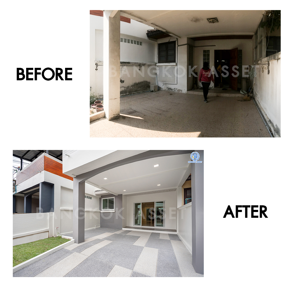 ในส่วนของหน้าบ้านและลานจอดรถ เราเคลียร์พื้นที่ทั้งหมดให้ดูโปร่งโล่ง ทำฝ้าเพดานใหม่ ทาสีใหม่ทั้งหลัง ทำให้บ้านดูสวยโมเดิร์นโดดเด่นกว่าบ้านหลังอื่นในซอยไปเลยครับ