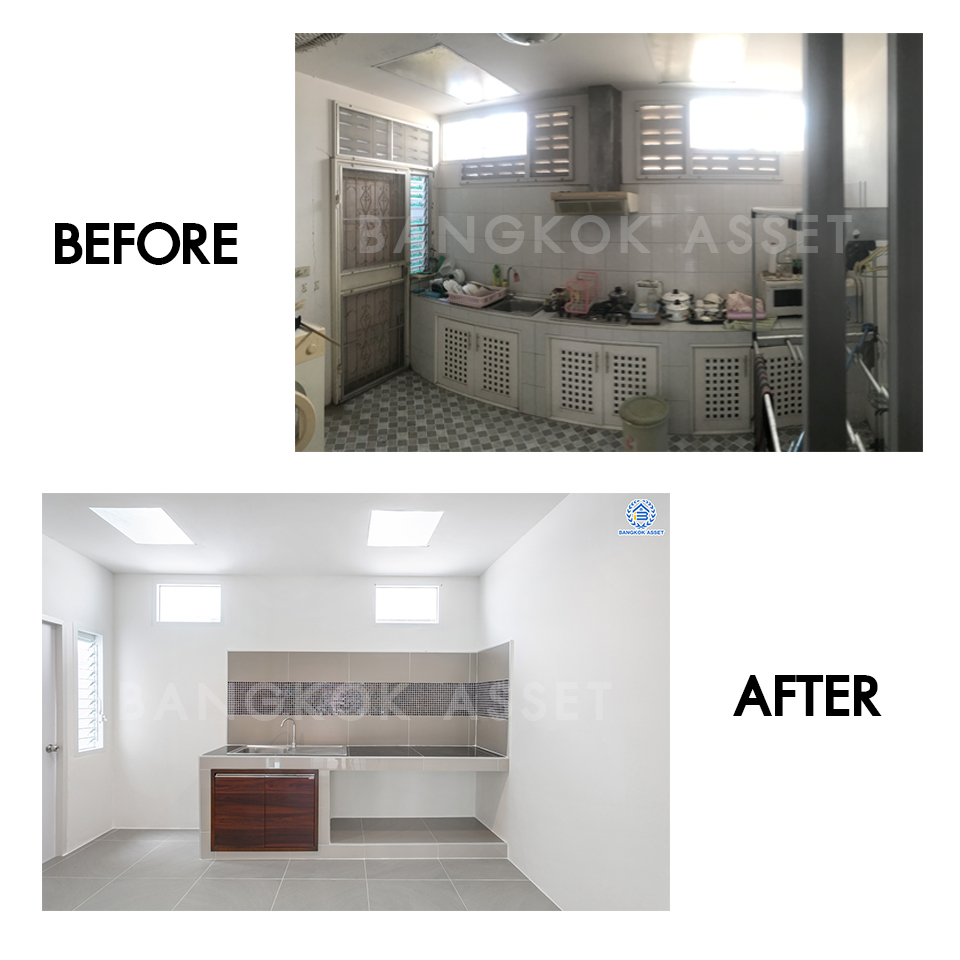 ห้องครัว เราเปลี่ยนกระเบื้องใหม่ให้ทั้งพื้นและผนัง ส่วนเคาน์เตอร์ครัวเดิมทีเป็นแบบ Built In เราก่อครัวปูนให้ใหม่ Top ด้วยกระเบื้องให้ความแข็งแรง ทนทาน ใช้งานได้ยาวๆ ไปเลย ส่วนประตูหน้าต่าง เราก็เปลี่ยนให้ใหม่ทั้งหมดครับ