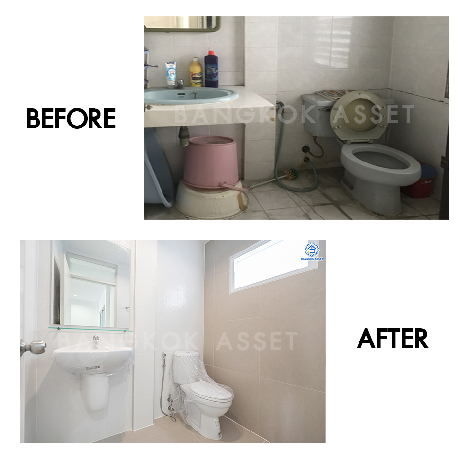 ห้องน้ำเรียกว่าทำให้ใหม่ทั้งหมด ไม่ว่าจะเปลี่ยนสุขภัณฑ์ใหม่ เปลี่ยนกระเบื้องผนังใหม่ และเปลี่ยนกระเบื้องพื้นแบบกันลื่นเพื่อความปลอดภัย นอกจากวัสดุที่เปลี่ยนให้ใหม่หมดแล้ว เรื่องของระบบน้ำ ระบบระบายน้ำ และระบบไฟฟ้าเราก็ดูแลให้เช่นกัน