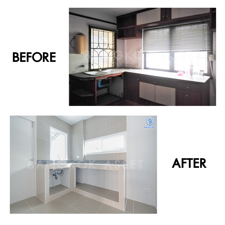 ห้องครัว เราเปลี่ยนกระเบื้องใหม่ให้ทั้งพื้นและผนัง ส่วนเคาน์เตอร์ครัวเดิมทีเป็นแบบ Built In เราก่อครัวปูนให้ใหม่ Top ด้วยกระเบื้องให้ความแข็งแรง ทนทาน ใช้งานได้ยาวๆ ไปเลย ส่วนประตูหน้าต่าง เราก็เปลี่ยนให้ใหม่ทั้งหมดครับ