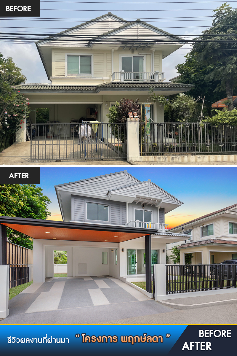ในส่วนของหน้าบ้านและลานจอดรถ เราเคลียร์พื้นที่ทั้งหมดให้ดูโปร่งโล่ง ทำฝ้าเพดานใหม่ ทาสีใหม่ทั้งหลัง พร้อมต่อเติมหลังคาลานจอดรถออกมาให้ด้วย ส่วนพื้นลานจอดรถเราใช้ พื้นทรายล้าง ทำให้หน้าบ้านดู Modern และ Luxury สร้างเอกลักษณ์ได้ในแบบเฉพาะตัว พร้อมทั้งยังมีความแข็งแรง ทนทาน กันลื่นได้เป็นอย่างดี
