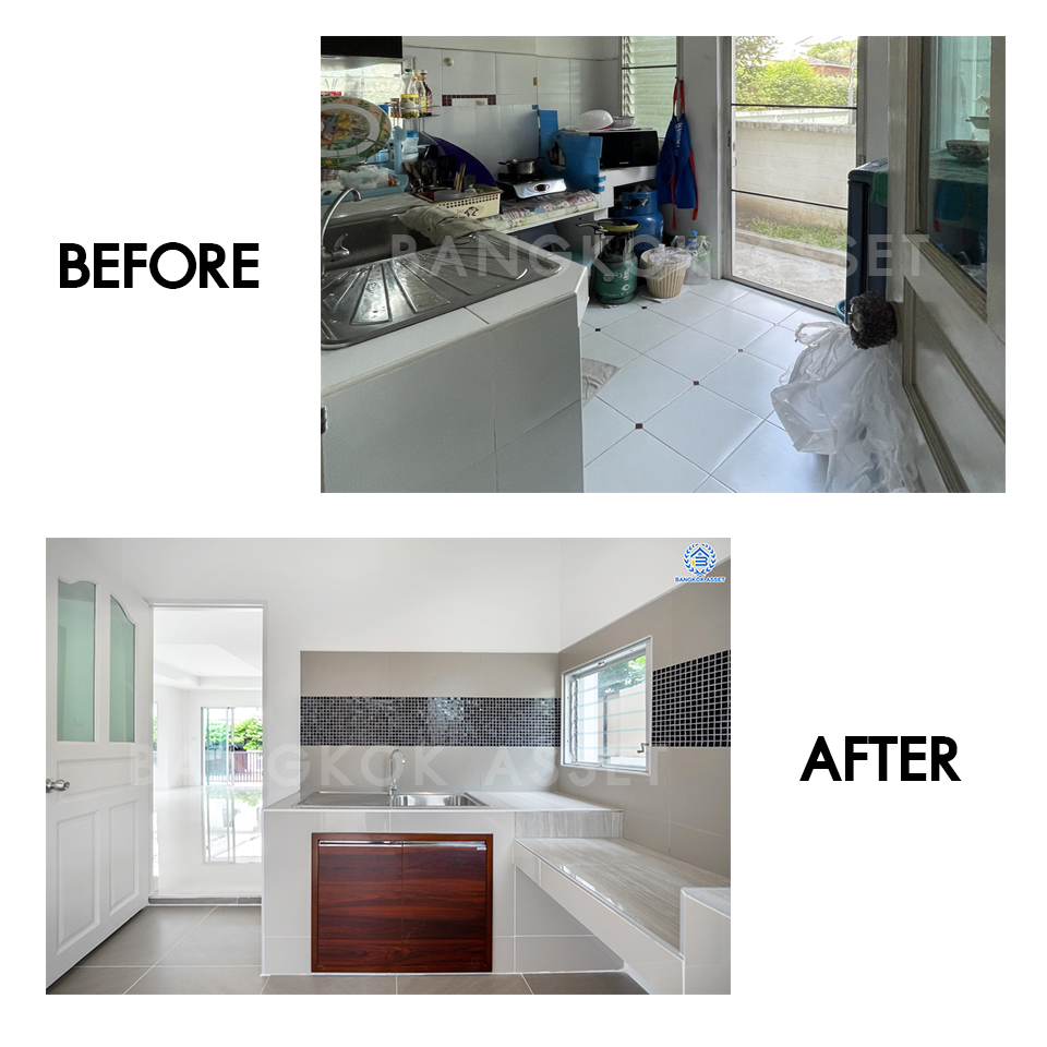 ห้องครัว เราเปลี่ยนกระเบื้องใหม่ให้ทั้งพื้นและผนัง ส่วนเคาน์เตอร์ครัวเดิมทีเป็นแบบ Built In เราก่อครัวปูนให้ใหม่ Top ด้วยกระเบื้องให้ความแข็งแรง ทนทาน ใช้งานได้ยาวๆ ไปเลย ส่วนประตูหน้าต่าง เราก็เปลี่ยนให้ใหม่ทั้งหมดครับ