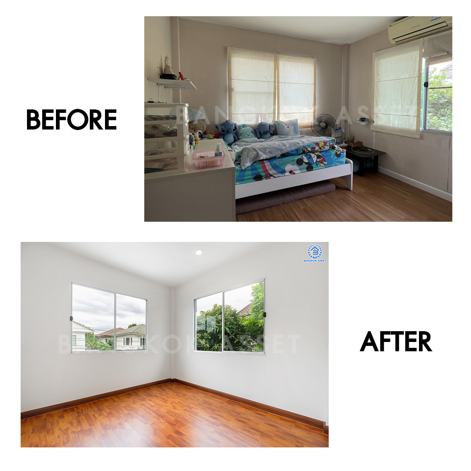 ห้องนอนทุกห้องเราเปลี่ยนประตู หน้าต่างให้ ส่วนฝ้าเพดานเราก็เปลี่ยนให้ใหม่ พร้อมติดไฟดาวน์ไลท์ให้เช่นกัน และเปลี่ยนพื้นเป็นลามิเนตให้ใหม่ทั้งหมด เพราะดูแลรักษาความสะอาดง่าย ทนต่อน้ำยาทำความสะอาดต่างๆ และทนต่อรอยขีดข่วนได้ดี