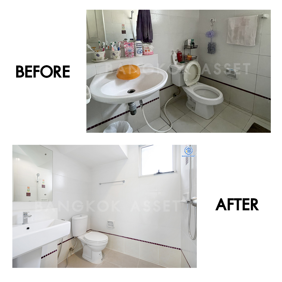 ห้องน้ำเรียกว่าทำให้ใหม่ทั้งหมด ไม่ว่าจะเปลี่ยนสุขภัณฑ์ใหม่ เปลี่ยนกระเบื้องผนังใหม่ และเปลี่ยนกระเบื้องพื้นแบบกันลื่นเพื่อความปลอดภัย นอกจากวัสดุที่เปลี่ยนให้ใหม่หมดแล้ว เรื่องของระบบน้ำ ระบบระบายน้ำ และระบบไฟฟ้าเราก็ดูแลให้เช่นกัน