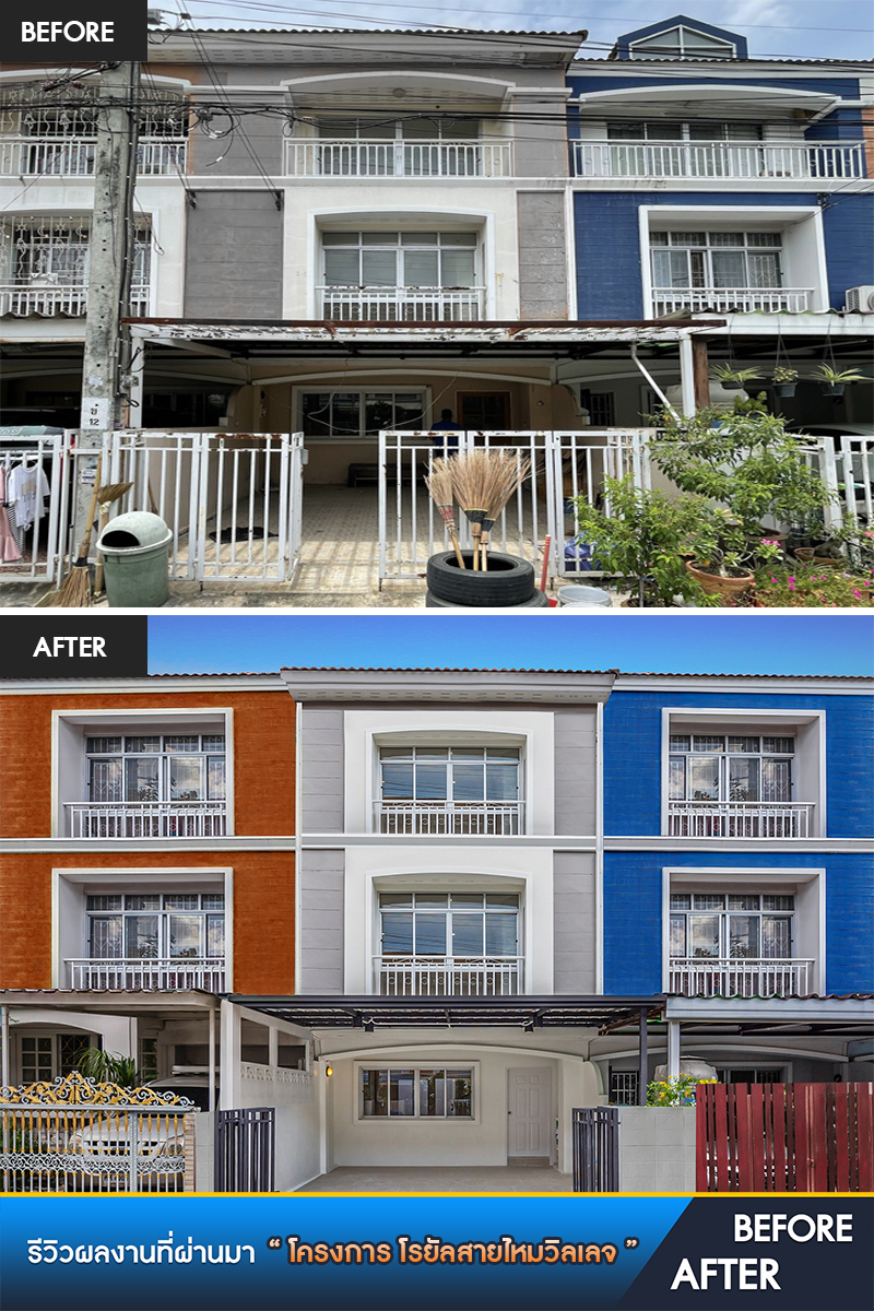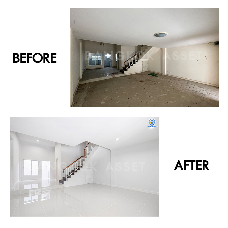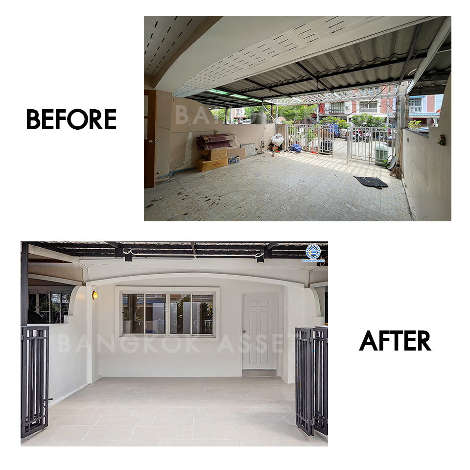จากทาวน์โฮมเก่าที่ผ่านการใช้งาน เราได้แปลงสภาพลใหม่ทั้งหลัง ไม่ว่าจะเป็นการทาสีใหม่ให้ดูขาวสว่างยิ่งขึ้น ในส่วนของหน้าบ้านและลานจอดรถ เราเปลี่ยนทั้งรั้ว พื้น หลังคาให้ใหม่ทั้งหมด