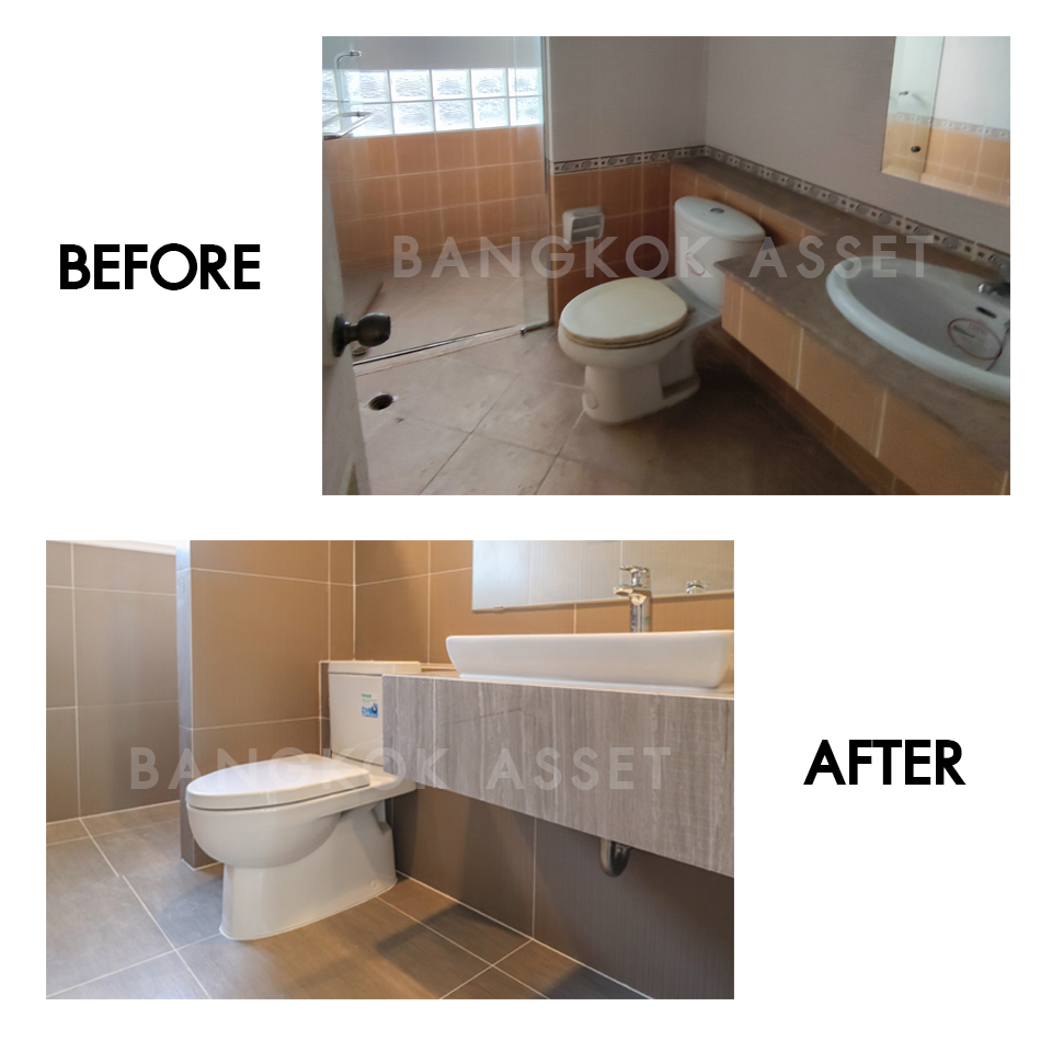 ห้องน้ำเรียกว่าทำให้ใหม่ทั้งหมด ไม่ว่าจะเปลี่ยนสุขภัณฑ์ใหม่ เปลี่ยนกระเบื้องผนังใหม่ และเปลี่ยนกระเบื้องพื้นแบบกันลื่นเพื่อความปลอดภัย นอกจากวัสดุที่เปลี่ยนให้ใหม่หมดแล้ว เรื่องของระบบน้ำ ระบบระบายน้ำ และระบบไฟฟ้าเราก็ดูแลให้เช่นกัน