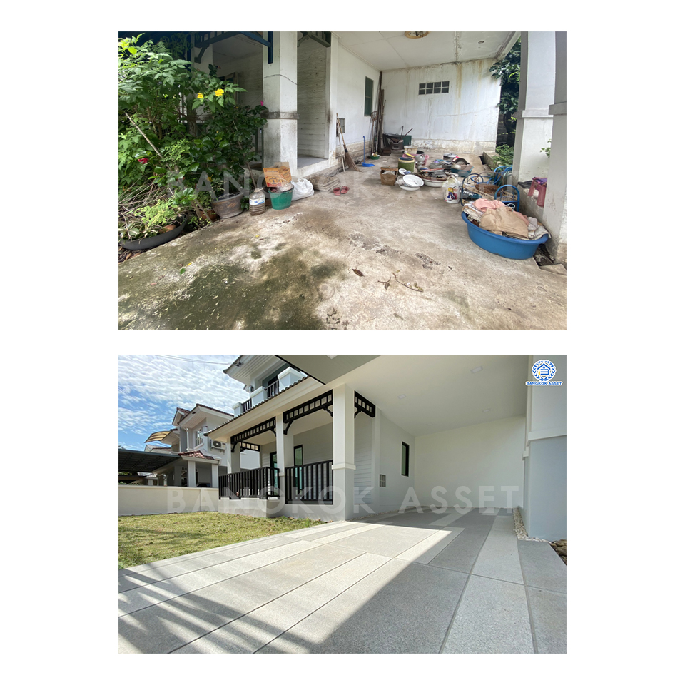 ในส่วนของหน้าบ้านและลานจอดรถ เราเคลียร์พื้นที่ทั้งหมดให้ดูโปร่งโล่ง ทำฝ้าเพดานใหม่ ทาสีใหม่ทั้งหลัง พร้อมต่อเติมหลังคาลานจอดรถออกมาให้ด้วย