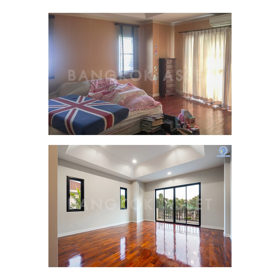 ห้องนอนทุกห้องเราเปลี่ยนประตู หน้าต่างให้ ส่วนฝ้าเพดานเราก็เปลี่ยนให้ใหม่ พร้อมติดไฟดาวน์ไลท์ให้เช่นกัน และขัดเคลือบพื้นปาร์เก้ให้ใหม่ทั้งหมด เพราะใช้ได้นาน ทนทาน ซ่อมง่าย ออกแบบลวดลายการปูได้ไม่จำกัด ทำให้บ้านมีเสน่ห์ อบอุ่น น่าอยู่