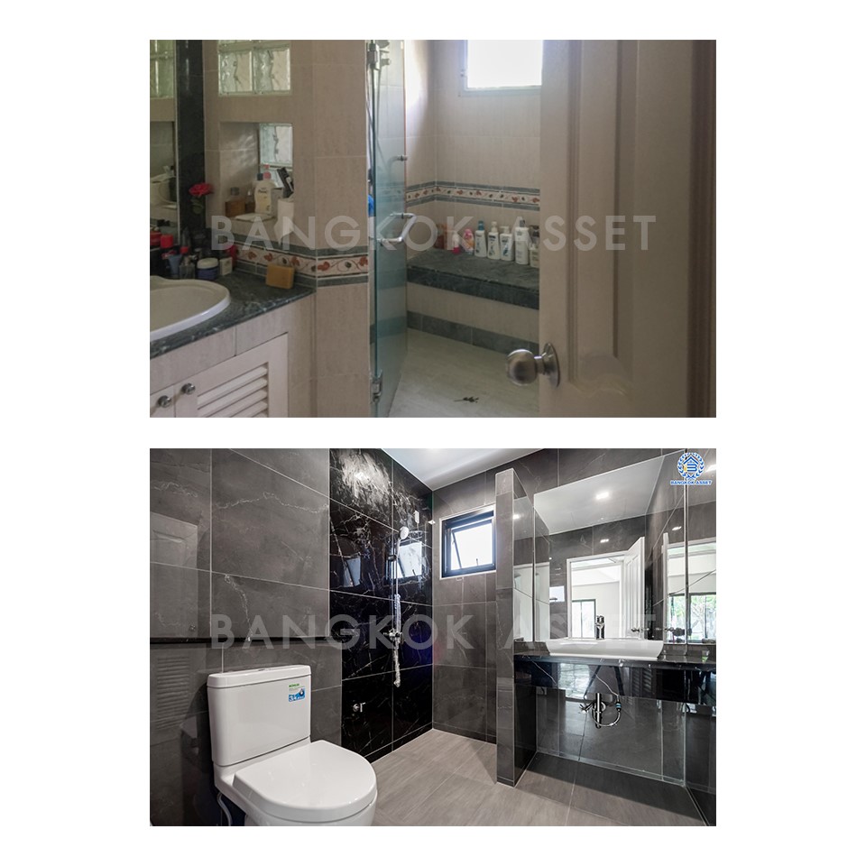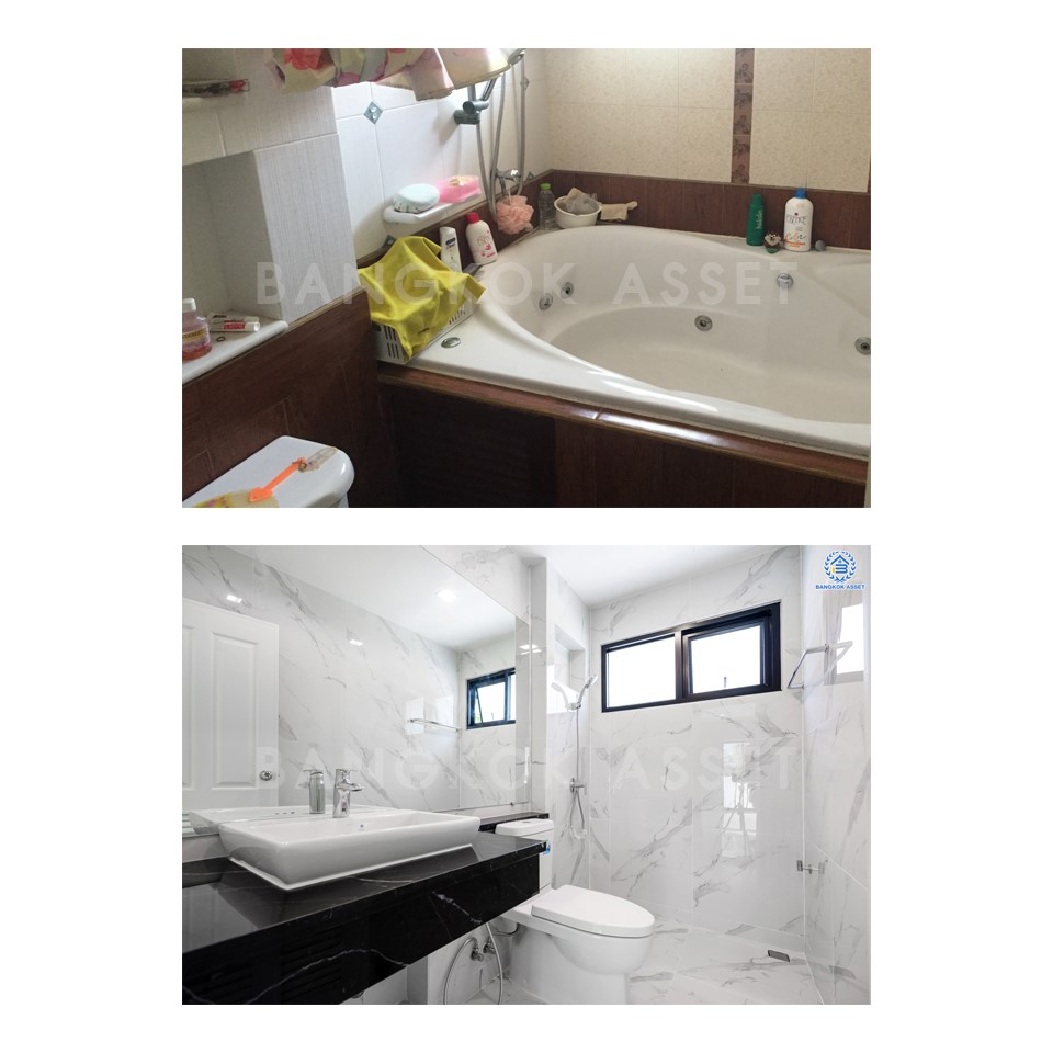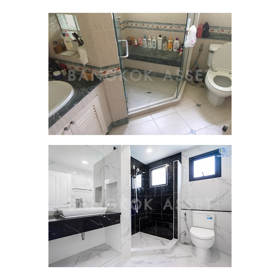 ห้องน้ำเรียกว่าทำให้ใหม่ทั้งหมด ไม่ว่าจะเปลี่ยนสุขภัณฑ์ใหม่ เปลี่ยนกระเบื้องผนังใหม่ และเปลี่ยนกระเบื้องพื้นแบบกันลื่นเพื่อความปลอดภัย นอกจากวัสดุที่เปลี่ยนให้ใหม่หมดแล้ว เรื่องของระบบน้ำ ระบบระบายน้ำ และระบบไฟฟ้าเราก็ดูแลให้เช่นกัน