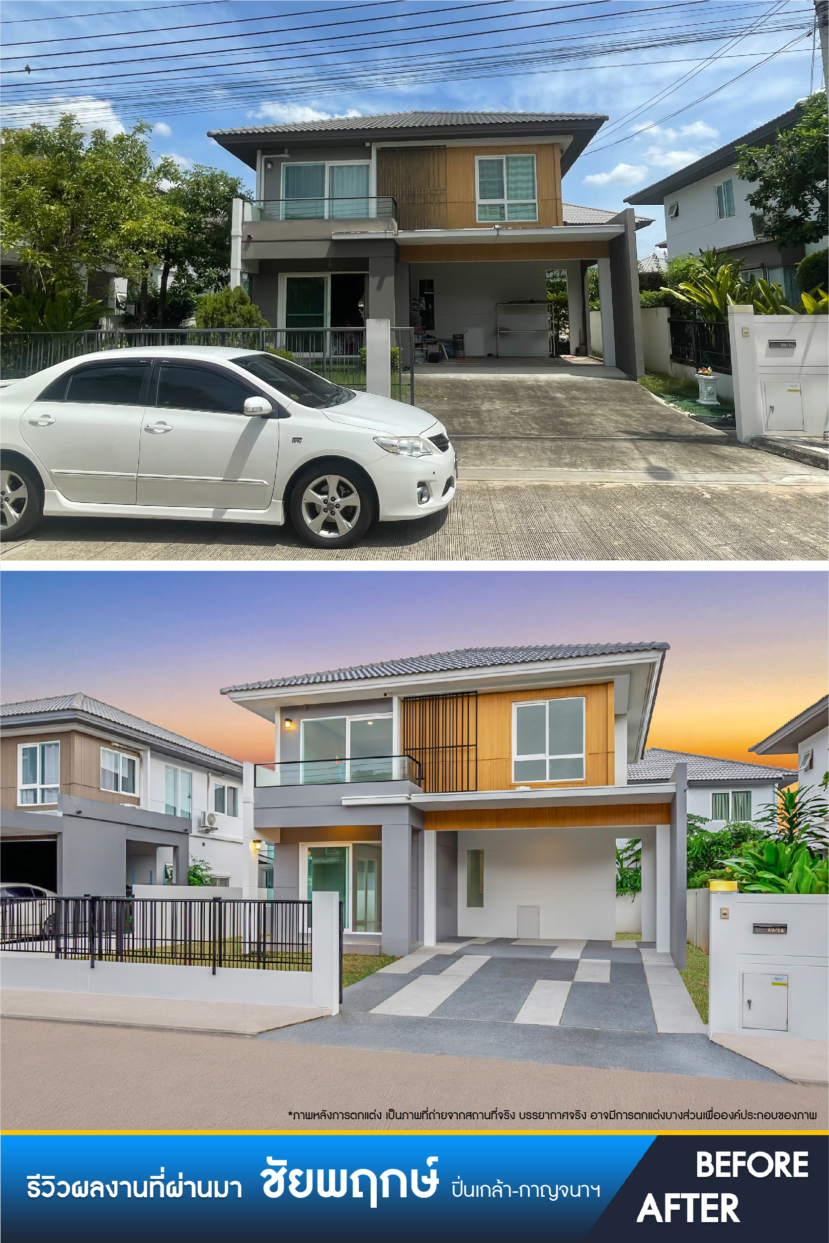 หน้าบ้านและลานจอดรถ เราเคลียร์พื้นที่ทั้งหมดให้ดูโปร่งโล่ง ทาสีใหม่ ส่วนพื้นลานจอดรถเราใช้พื้นทรายล้าง ทำให้หน้าบ้านดูหรูหราสร้างเอกลักษณ์ได้ในแบบเฉพาะตัวบ้านของบางกอกฯ