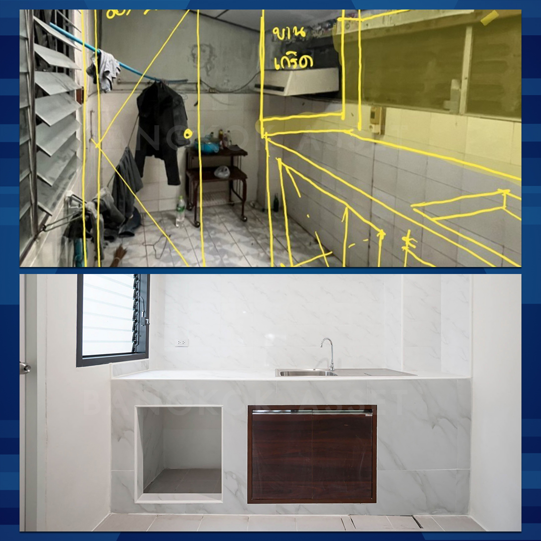 ห้องครัว ต่อเติมให้ใหม่ เพิ่มเคาน์เตอร์ครัวพร้อมซิงค์ล้างจานให้พร้อมใช้งาน เปลี่ยนกระเบื้องให้ทั้งพื้นและผนัง ถ้าส่วนไหนไม่สวยหรือชำรุดเราเปลี่ยนให้ใหม่ทั้งหมดเลยครับ