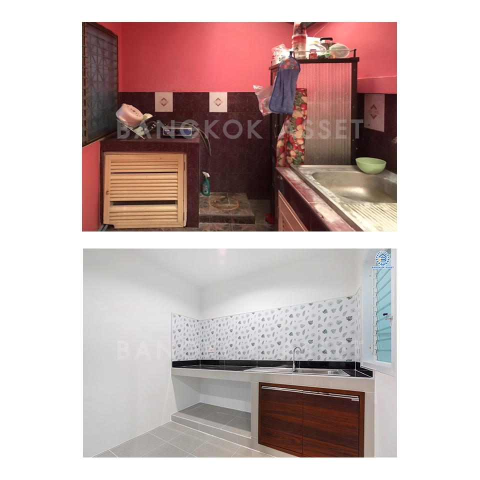 ห้องครัว เราทาสีใหม่ทั้งหมด ปูกระเบื้องพื้นใหม่แบบกันลื่น และกระเบื้องผนังให้ใหม่ด้วย ทำเคาน์เตอร์ครัวใหม่ ดูสวยงามครบครันทุกฟังก์ชัน และเก็บของได้เป็นสัดส่วนมากขึ้นอีกด้วย