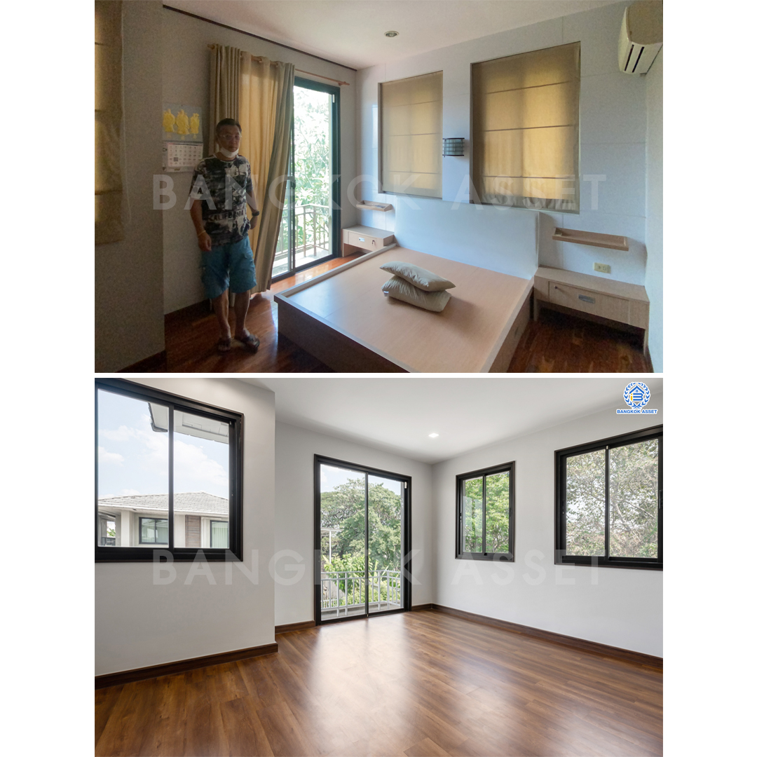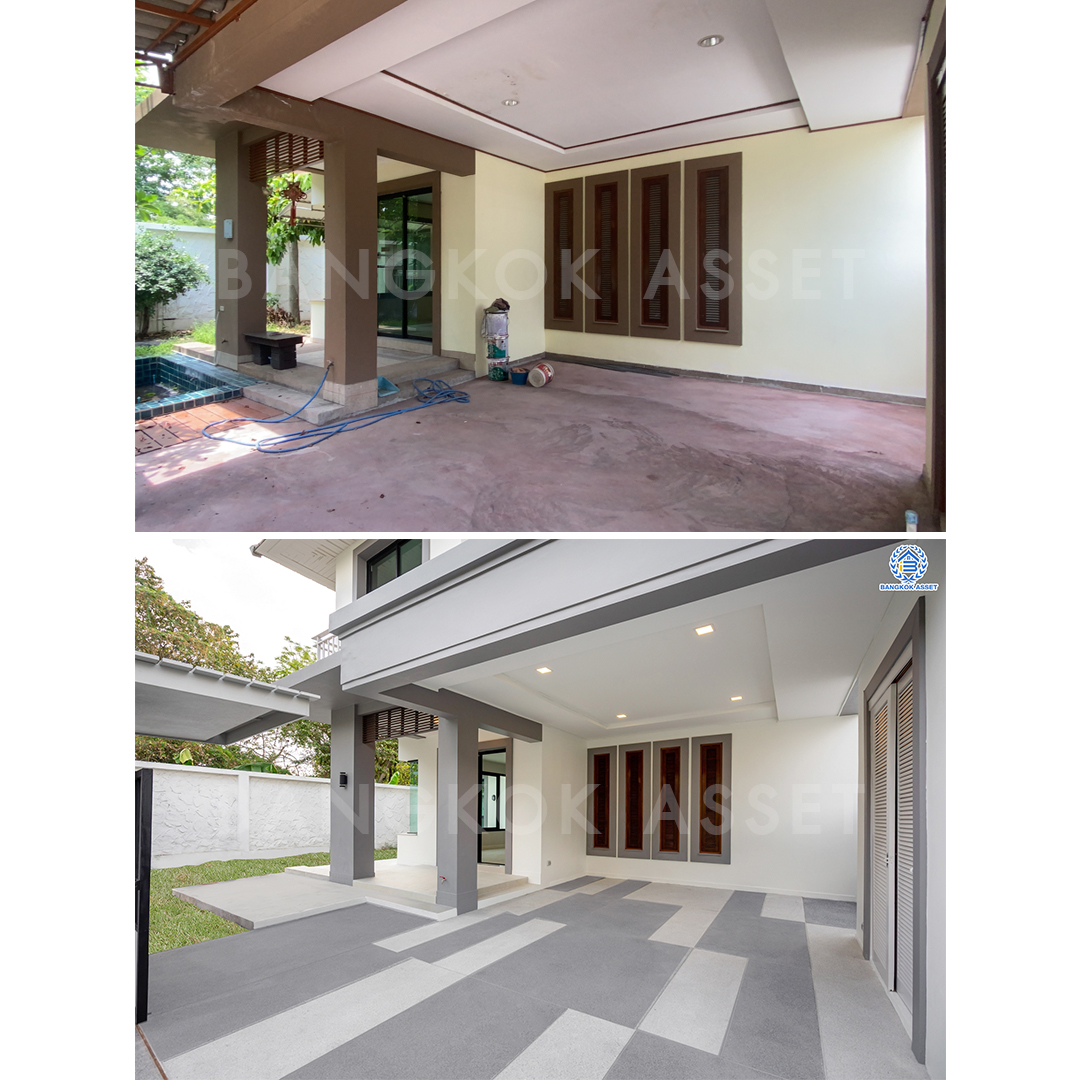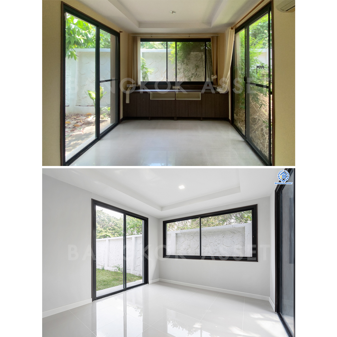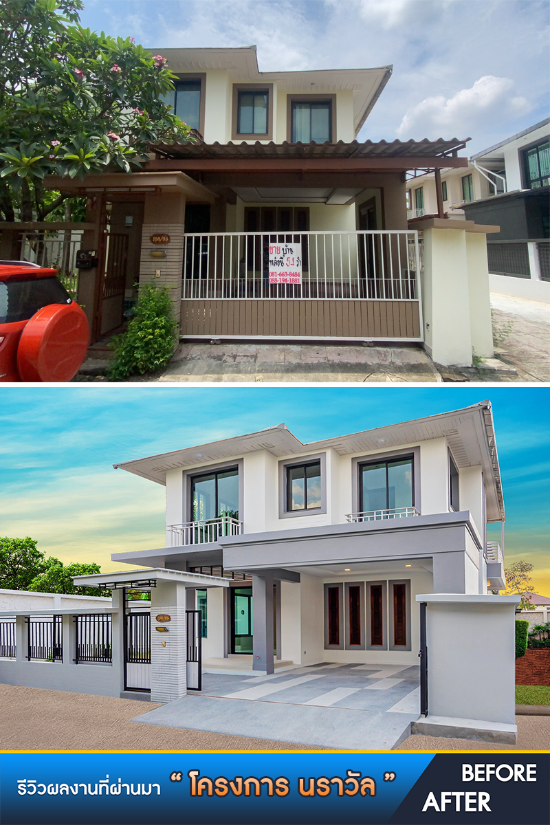 เราได้แปลงสภาพใหม่ทั้งหลัง เคลียร์พื้นที่ทั้งหมดให้ดูโปร่งโล่ง น่าอยู่อาศัย พร้อมทาสีใหม่ให้ดูขาวสว่างยิ่งขึ้น ส่วนพื้นลานจอดรถเราใช้พื้นทรายล้าง ทำให้หน้าบ้านดูหรูหราสร้างเอกลักษณ์ได้ในแบบเฉพาะตัว และยังปูหญ้าให้อีกด้วยครับ