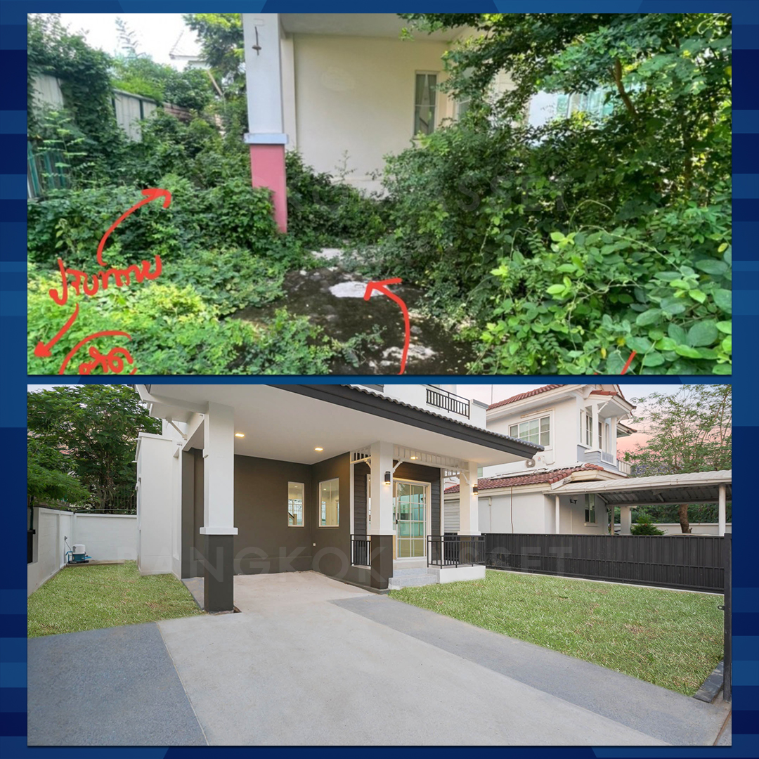 จากบ้านหลังเดิมๆ เราได้แปลงสภาพตกแต่งใหม่ ไม่ว่าจะเป็นการทาสีใหม่ให้ดูขาวสว่างยิ่งขึ้น ขัดเคลือบพื้นลานจอดให้เหมือนใหม่ รวมถึงตัดแต่งต้นไม้รอบบ้านให้เรียบร้อยสวยงาม