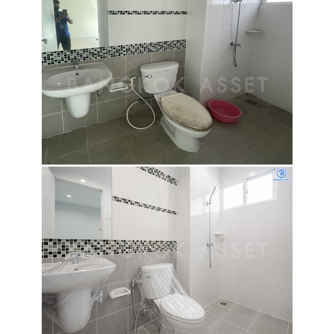 ห้องน้ำเปลี่ยนสุขภัณฑ์ใหม่ เปลี่ยนกระเบื้องพื้นแบบกันลื่นเพื่อความปลอดภัย นอกจากวัสดุที่เปลี่ยนให้ใหม่หมดแล้ว เรื่องของระบบระบายน้ำ และระบบไฟฟ้าเราก็ดูแลให้เช่นกันครับ