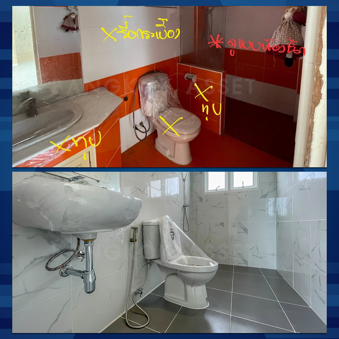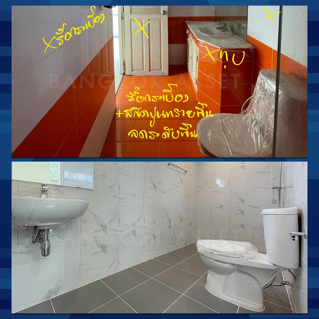 ห้องน้ำเรียกว่าทำให้ใหม่ทั้งหมด ไม่ว่าจะเปลี่ยนสุขภัณฑ์ เปลี่ยนกระเบื้องพื้นกันลื่น เปลี่ยนกระเบื้องผนังใหม่ลายหินอ่อน รวมไปถึงอุปกรณ์ต่าง ๆ ในห้องน้ำ ส่วนระบบระบายน้ำ และระบบไฟฟ้าเราก็ตรวจสอบดูแลอย่างดี ติดขัดตรงไหนเราซ่อมให้ หรือเปลี่ยนใหม่ให้เลยครับ