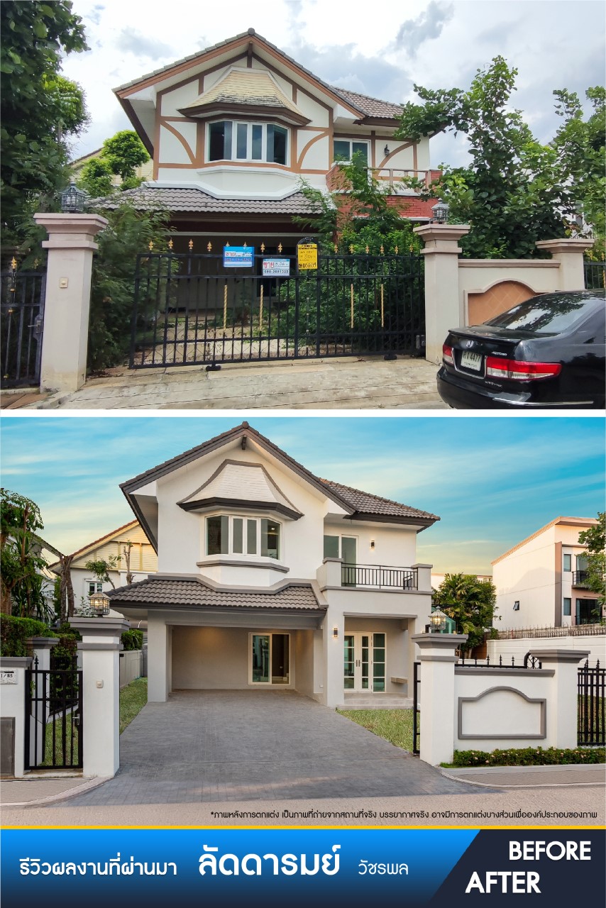 แม้บ้านจะผ่านการใช้งานมามากน้อยแค่ไหน เราก็ทำให้ใหม่ทั้งหลัง ไม่ว่าจะเป็นการทาสีใหม่ให้ดูขาวสว่างยิ่งขึ้น ส่วนพื้นลานจอดรถเราใช้พื้นคอนกรีตพิมพ์ลายมีความแข็งแรงทนทาน กว่าพื้นคอนกรีตปกติทำความสะอาด และดูแลรักษาง่าย ทำให้หน้าบ้านดูหรูหรามากยิ่งขึ้น