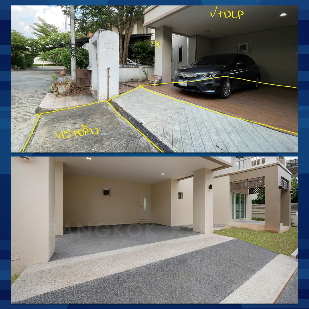 เปลี่ยนพื้นที่จอดรถเป็นพื้นทรายล้างที่เข้ากับธีมบ้านทั้งหลัง พร้อมปรับทางลาดให้ใหม่ นอกจากความสวยงามยังกันลื่นได้เป็นอย่างดี และแข็งแรงอีกด้วย