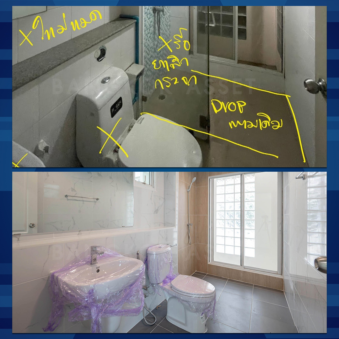 ห้องน้ำเราเปลี่ยนสุขภัณฑ์ เปลี่ยนกระเบื้องพื้นแบบกันลื่นเพื่อความปลอดภัย และเปลี่ยนกระเบื้องผนังลายหินอ่อนใหม่ทั้งหมด ส่วนเรื่องระบบระบายน้ำ ระบบไฟฟ้าเราก็ดูแลตรวจสอบแก้ไขให้พร้อมใช้งานได้อย่างดี