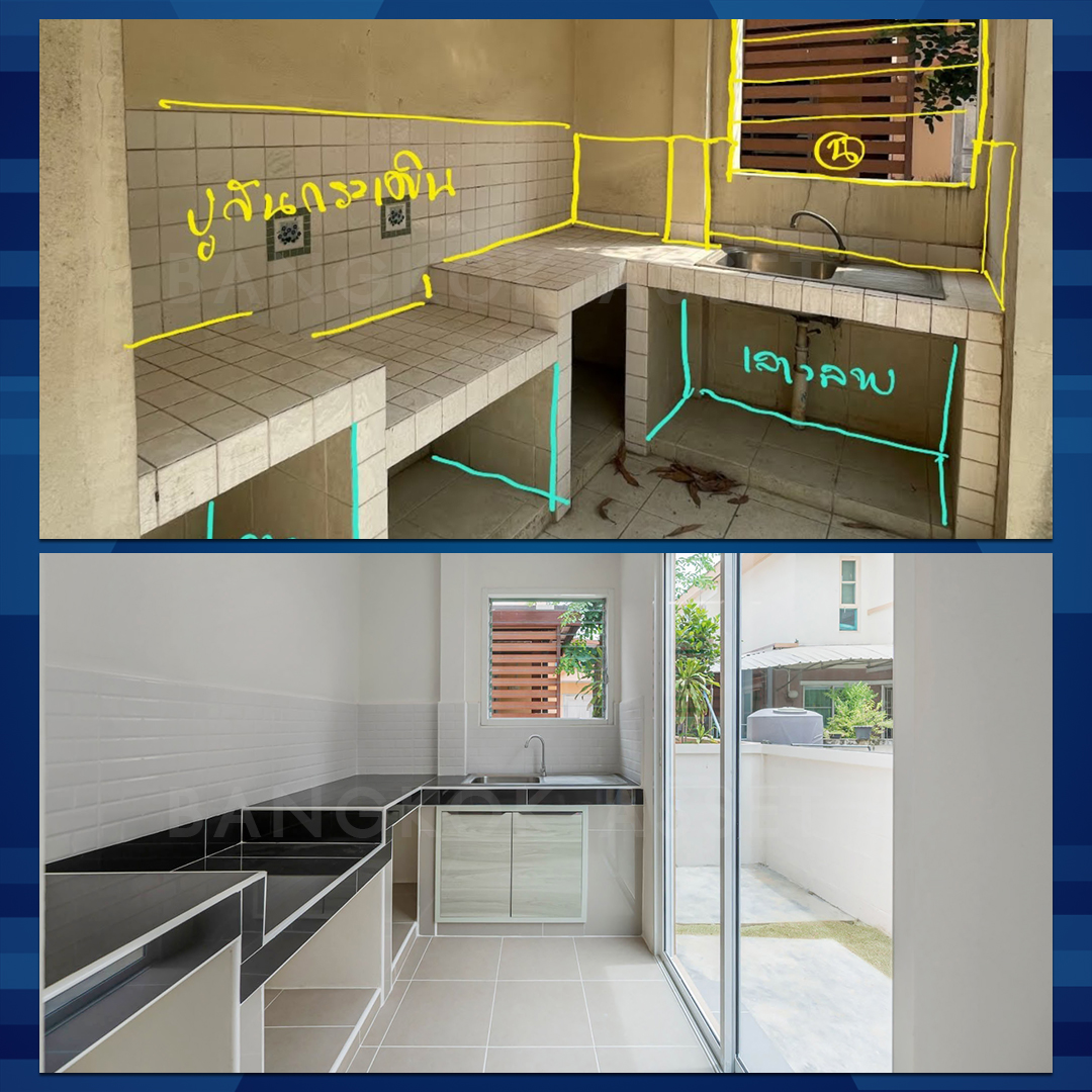ห้องครัว ปูกระเบื้องพื้นใหม่แบบกันลื่น เปลี่ยนกระเบื้องผนัง ฝ้าเพดาน ประตู หน้าต่าง หลอดไฟใหม่ทั้งหมด รวมทั้งทำเคาน์เตอร์ครัวใหม่ให้ใช้งานได้ครบทุกฟังก์ชันจริง ๆ