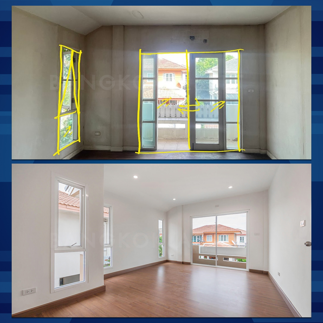 ห้องนอนทุกห้องเปลี่ยนประตู หน้าต่างอลูมิเนียมบานเลื่อนใหม่ พร้อมเปลี่ยนพื้นไม้ลามิเนตลายไม้ โดยคุมโทนสีภายในห้องเป็นโทนขาวสว่าง เพิ่มความรู้สึกผ่อนคลายให้กับผู้อยู่อาศัยอีกด้วย