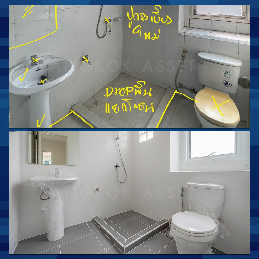 ห้องน้ำตกแต่งสไตล์โมเดิร์น คัดสรรวัสดุคุณภาพพรีเมี่ยม ปูกระเบื้องผนัง และปูกระเบื้องพื้นแบบกันลื่นเพื่อความปลอดภัย พร้อมเปลี่ยนสุขภัณฑ์ใหม่ รวมถึงดูแลระบบน้ำ ระบบไฟให้พร้อมใช้งานได้เหมือนบ้านใหม่เลยครับ