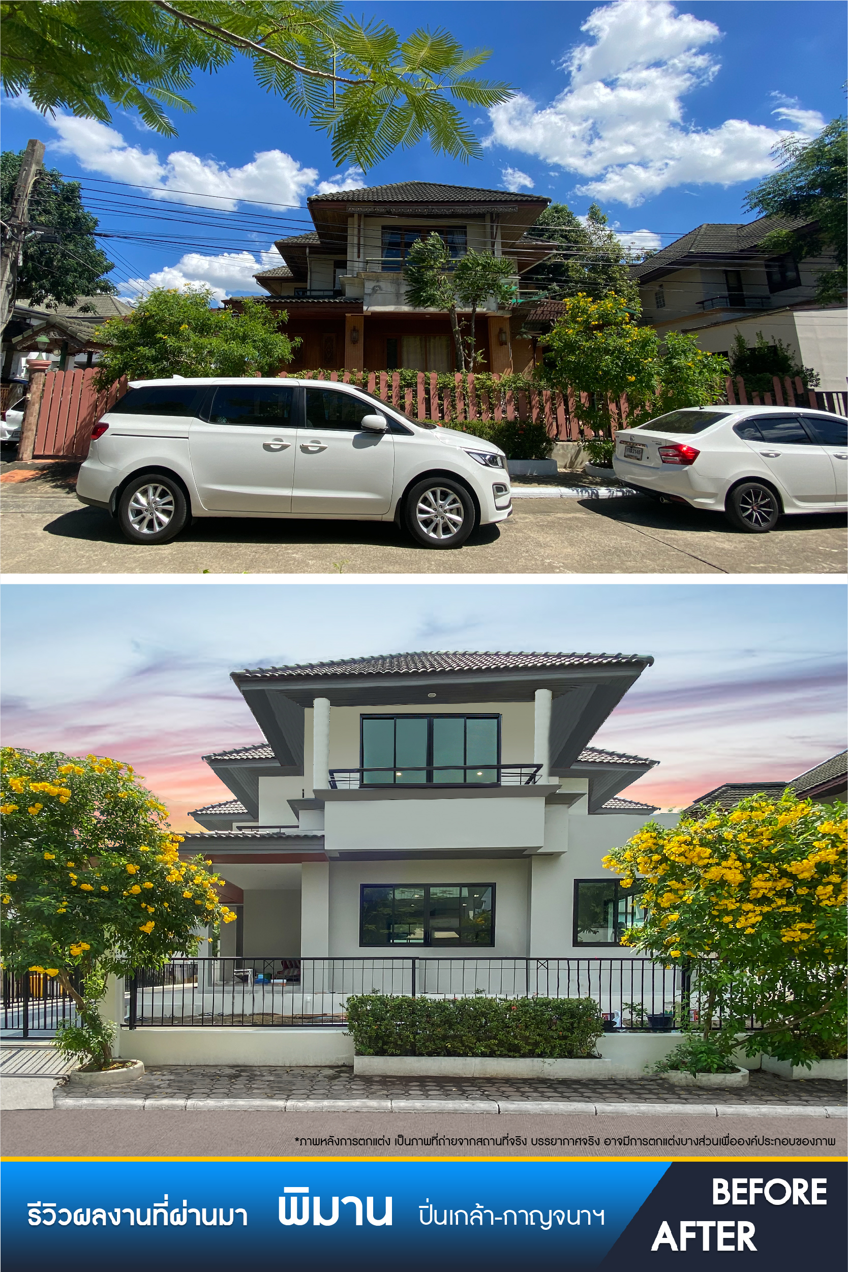 จากบ้านเก่าที่ค่อนข้างมีอายุเราได้แปลงสภาพตกแต่งใหม่ทั้งหลัง ในส่วนของหน้าบ้านเราเคลียร์พื้นที่ทั้งหมดให้ดูโปร่งโล่ง ทาสีใหม่ รวมทั้งทำรั้วใหม่ด้วย
