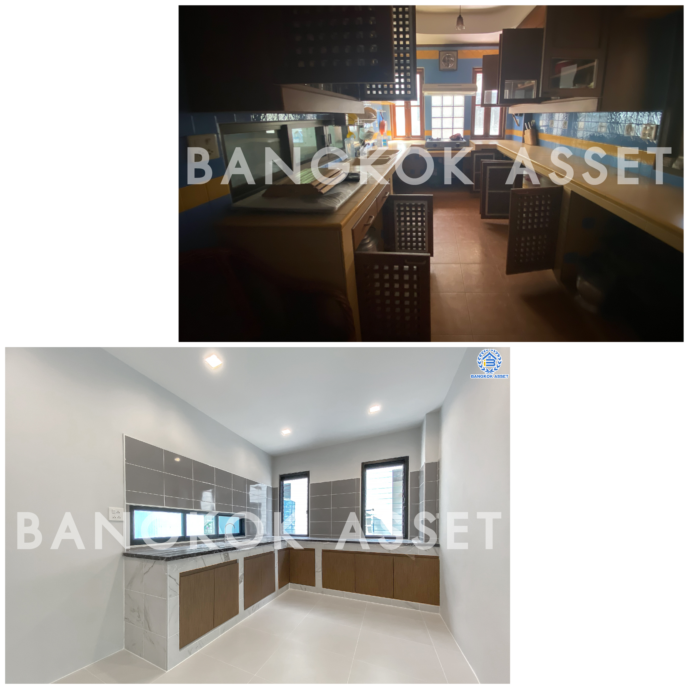ห้องครัว เราเปลี่ยนกระเบื้องใหม่ให้ทั้งพื้นและผนัง ส่วนเคาน์เตอร์ครัวเราก่อครัวปูนให้ใหม่ Top ด้วยกระเบื้องให้ความแข็งแรง ทนทาน ใช้งานได้ยาวๆ ไปเลย ส่วนประตูหน้าต่าง เราก็เปลี่ยนให้ใหม่ทั้งหมดครับ