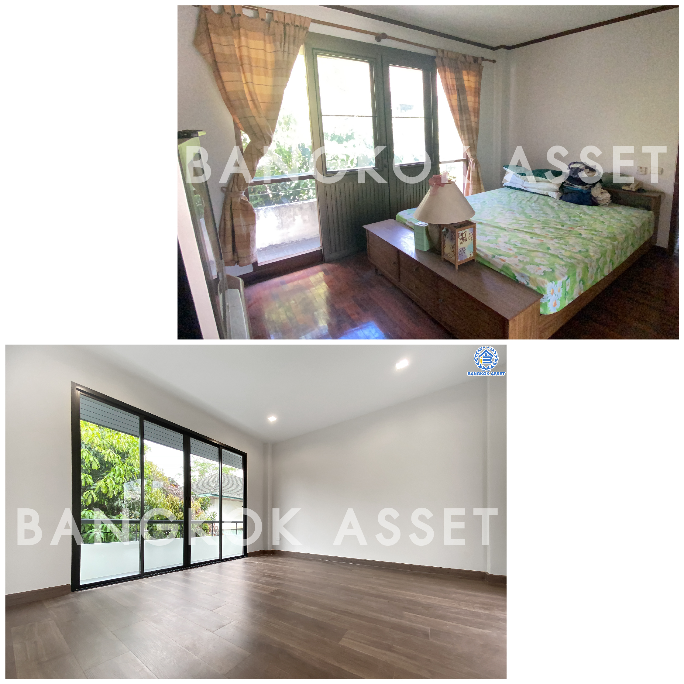 ห้องนอนทุกห้องเราคุมโทนสีภายในห้องเป็นโทนขาว เปลี่ยนพื้นไม้ลามิเนตใหม่ลายเหมือนไม้จริง ดูอบอุ่น สบาย มีความหนาและแข็งแรงมากยิ่งขึ้น เปลี่ยนประตูกระจกบานเลื่อน 4 บาน พร้อมติดตั้งไฟดาวน์ไลท์ที่ทำให้บ้านดูมีมิติมากขึ้น