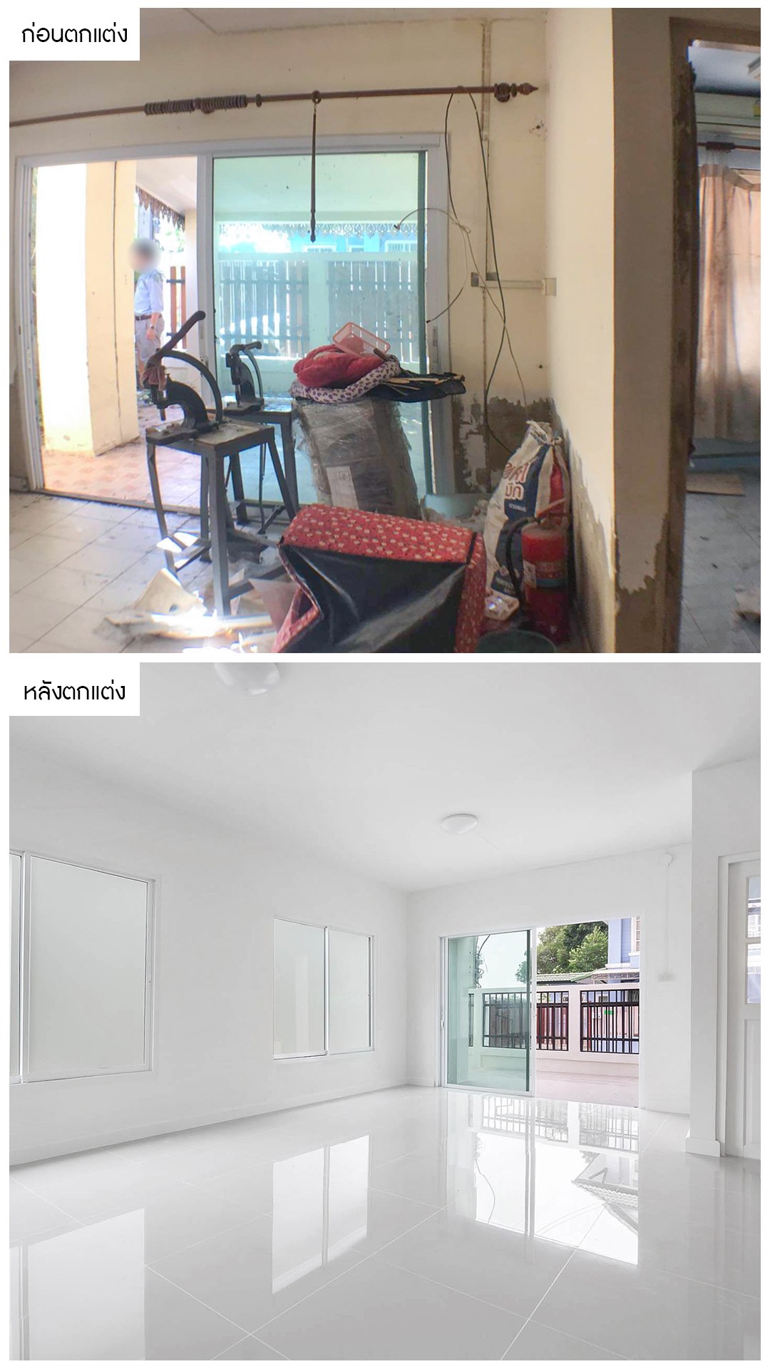 ภายในทาสีใหม่โดยเลือกใช้โทนสีขาว ที่ช่วยให้บ้านดูโปร่งกว้าง และสะอาดตา พร้อมปูพื้นด้วยกระเบื้องแกรนิโต้ ที่ทั้งสวยงาม และง่ายต่อการทำความสะอาด และประตู-หน้าต่างกระจกบานสไลด์พร้อมรับแสงธรรมชาติ