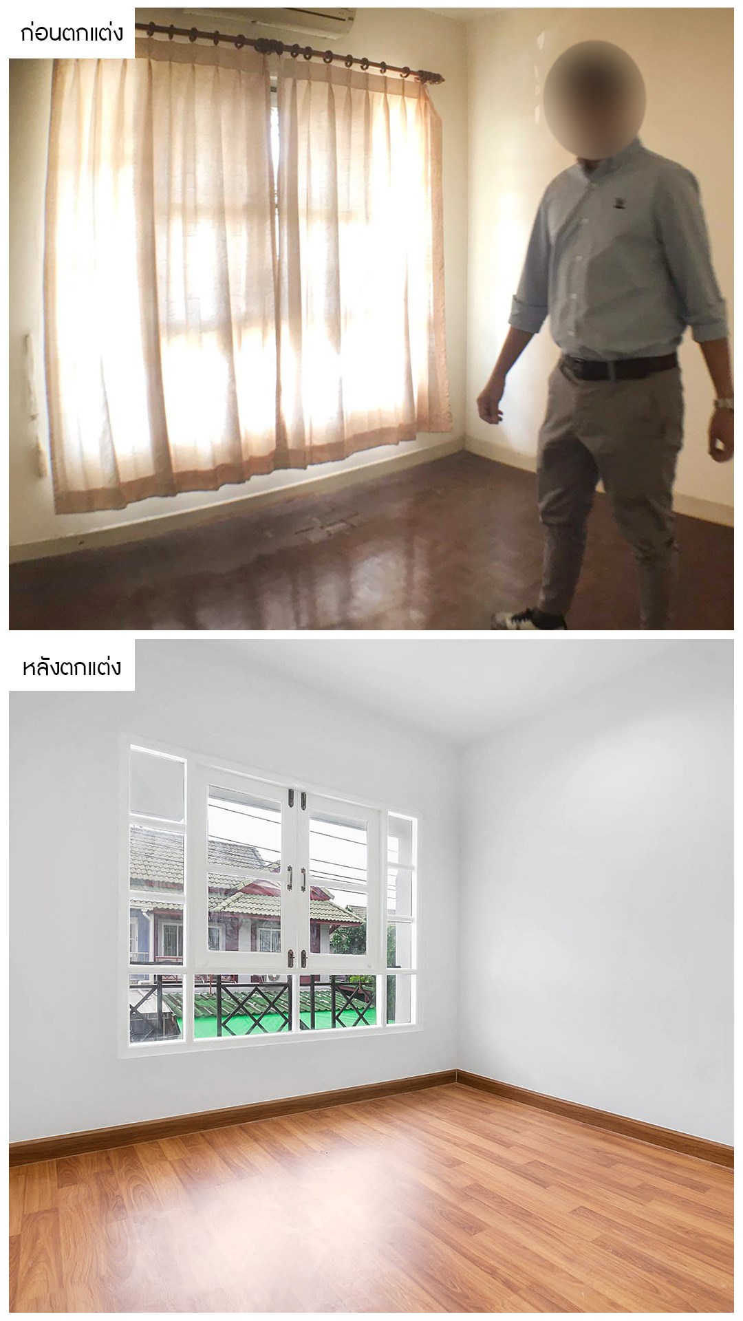 ห้องนอนได้รับการปรับปรุง โดยทาสีภายในใหม่ทั้งหมดเป็นโทนสีขาว พร้อมเปลี่ยนพื้นให้เป็นพื้นไม้ลามิเนตที่มีลวดลายสวยงาม และทนรอยขีดข่วน พร้อมไฟดาวน์ไลท์ที่ทำให้ห้องดูมีมิติ กลายเป็นห้องที่น่าพักผ่อนมากยิ่งขึ้น