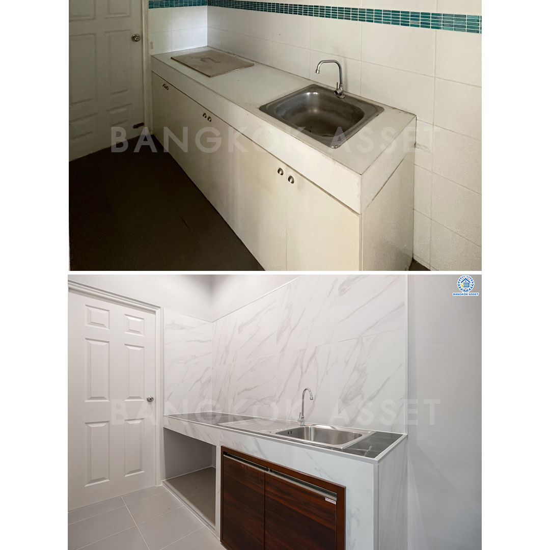 ห้องครัว เราทาสีใหม่ทั้งหมด ปูกระเบื้องพื้นใหม่แบบกันลื่น และกระเบื้องผนังให้ใหม่ด้วย ส่วนเคาน์เตอร์ครัวเดิมทีเป็นแบบ Built In เราก่อครัวปูนให้ใหม่ Top ด้วยกระเบื้องให้ความแข็งแรง ทนทาน ใช้งานได้ยาวๆ ไปเลย