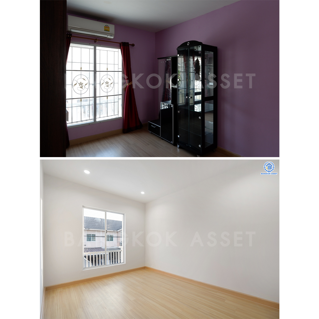 จากทาวน์โฮมที่ผ่านการใช้งาน เราตกแต่งใหม่ทั้งหลัง ไม่ว่าจะเป็นการทาสีใหม่ให้ดูขาวสว่างยิ่งขึ้น ส่วนหน้าบ้านและลานจอดรถ เราเคลียร์พื้นที่ให้ดูโปร่งโล่งน่าอยู่อาศัย สำหรับพื้นลานจอดรถเราเทพื้นทรายล้างที่นิยมใช้กับบ้านราคาสูงให้อีกด้วย