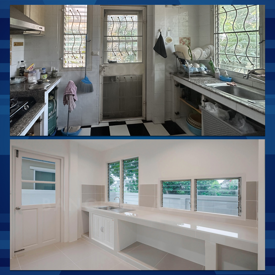 ห้องครัว เราเปลี่ยนกระเบื้องใหม่ให้ทั้งพื้น ผนัง เคาน์เตอร์ครัว และยังเพิ่มบานเก็บของและเปลี่ยนซิงค์ล้างจานใหม่ด้วย