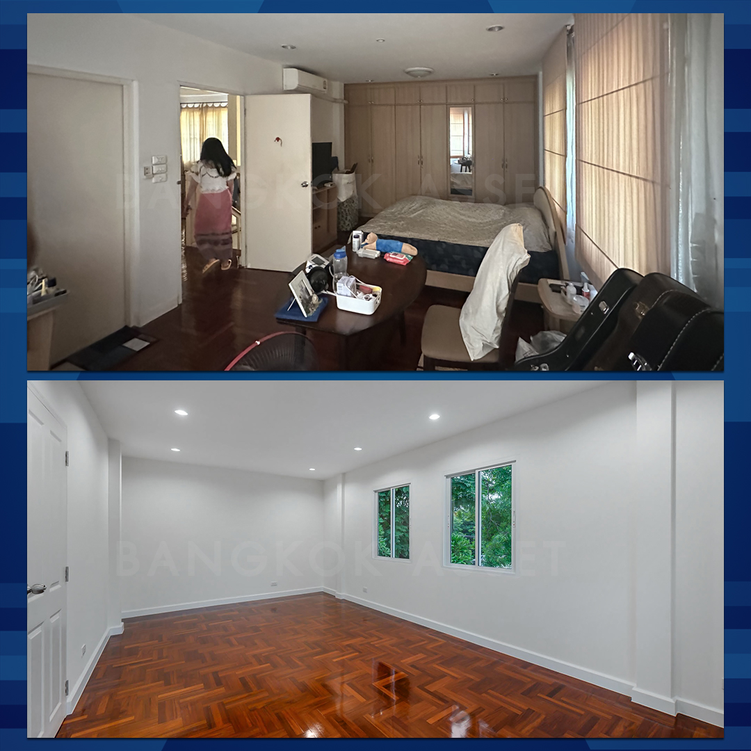 ห้องนอนทุกห้องเราขัดเคลือบพื้นไม้ปาร์เกต์ให้ใหม่ทั้งหมด โดยคุมโทนสีภายในห้องเป็นสีขาว และเปลี่ยนประตู หน้าต่าง พร้อมติดตั้งไฟดาวน์ไลท์ใหม่เช่นกัน
