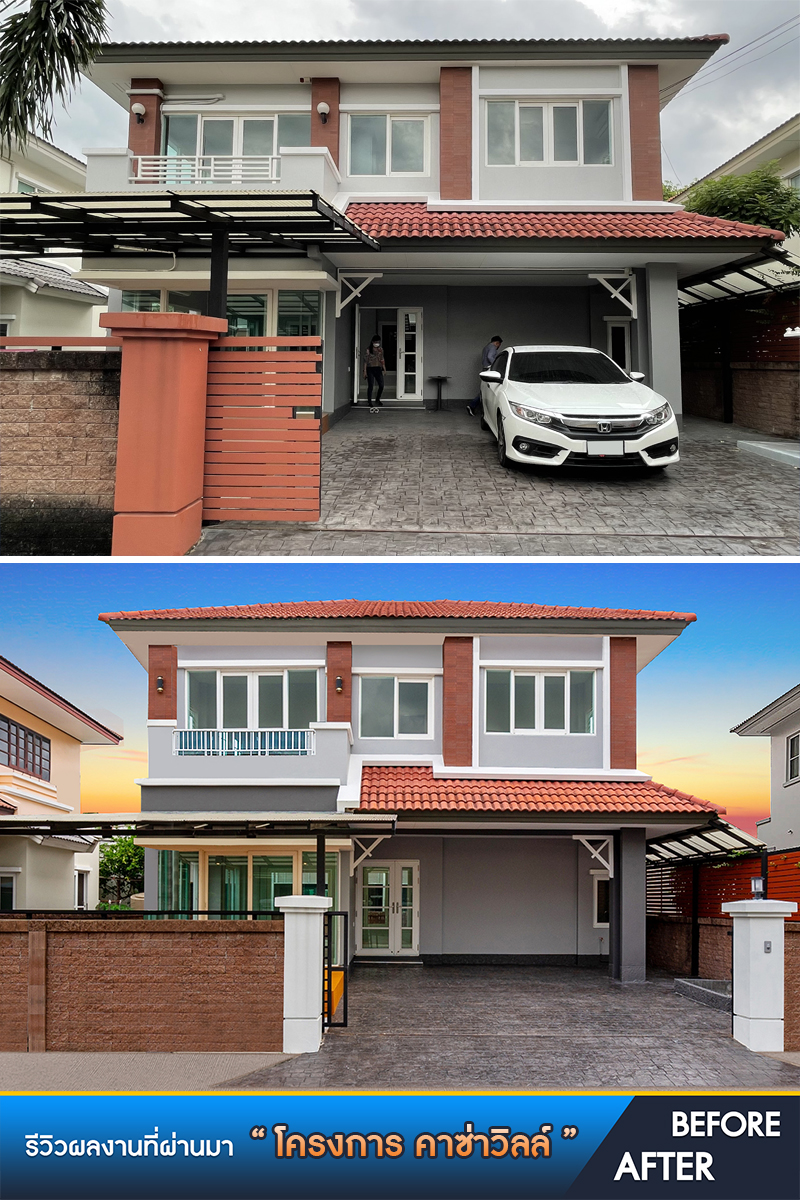 ในส่วนของหน้าบ้านเราเคลียร์พื้นที่ทั้งหมดให้โปร่งโล่ง แล้วปรับระดับพื้นใหม่ให้เรียบและสโลปไล่น้ำ อีกทั้งยังทาสีใหม่ และเปลี่ยนรั้วใหม่ให้อีกด้วย