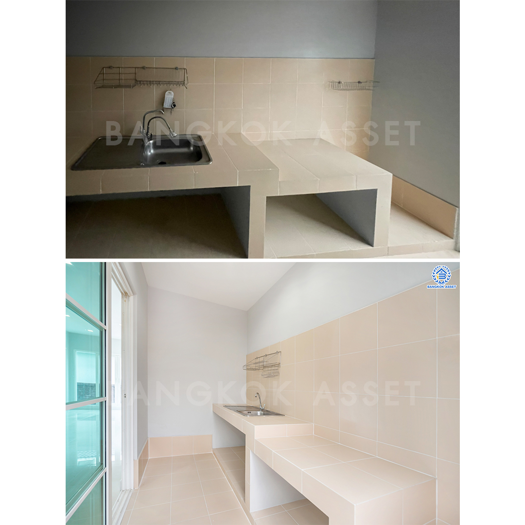 ห้องครัว ในส่วนเคาน์เตอร์ครัวเป็นแบบก่อปูนมีความแข็งแรง ทนทาน ใช้งานได้ยาวอยู่แล้วเหลือเพียงเก็บสี ลงยาแนวให้ใหม่เป็นอันสวยงามเหมือนเดิม